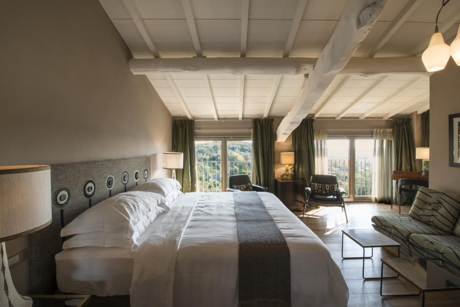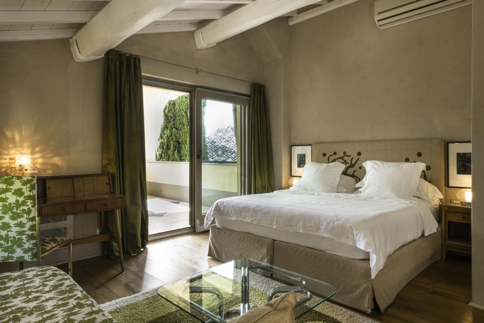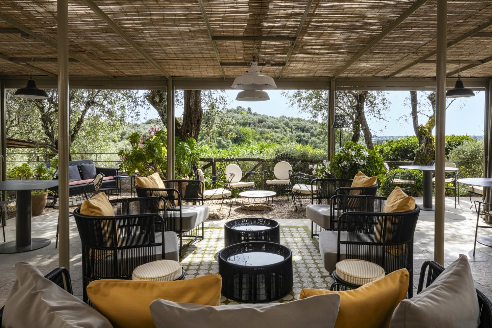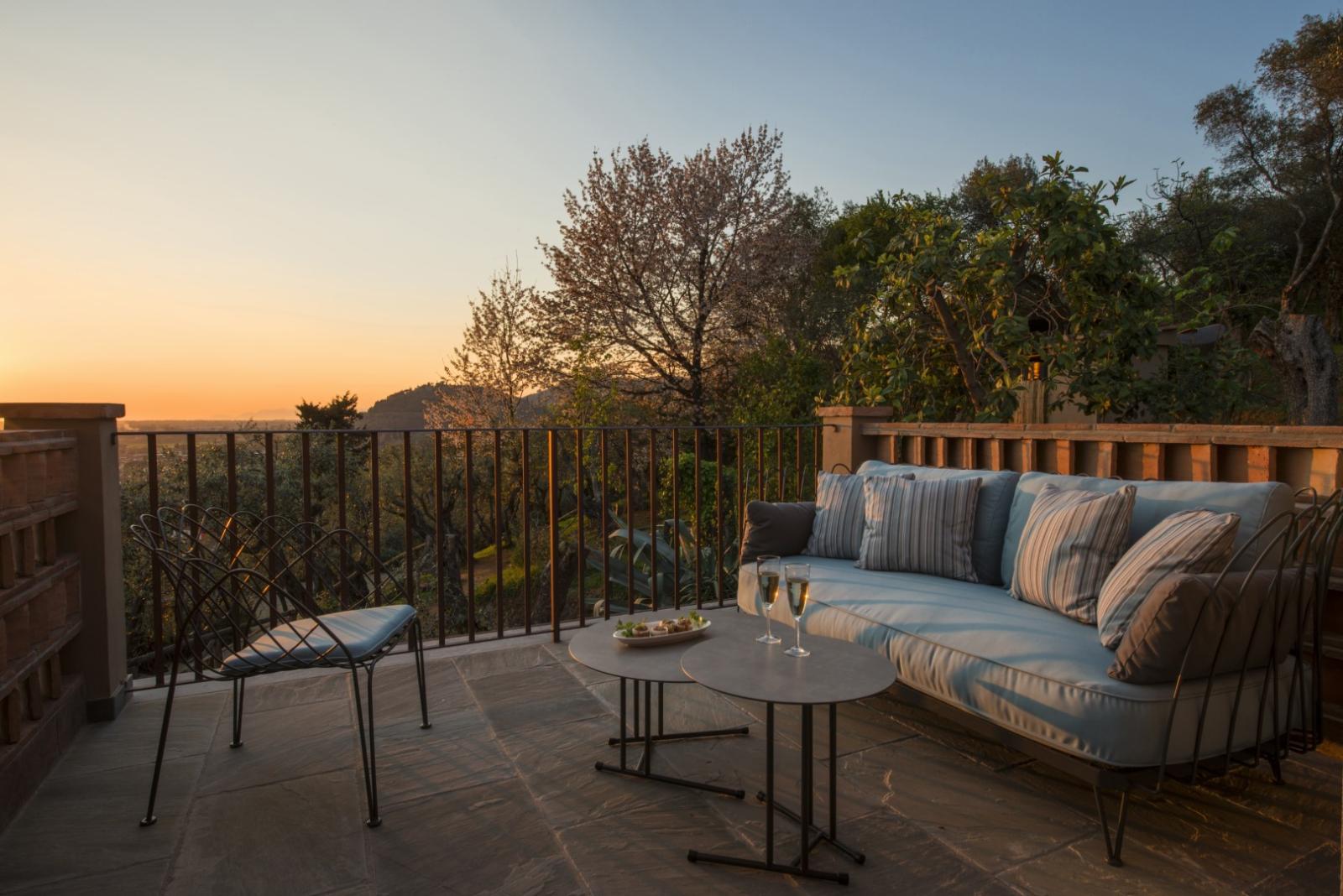 Elle compte 12 chambres et suites, toutes meublées avec goût et caractère, alliant design contemporain, art et pièces anciennes. Les espaces communs comprennent des salons avec cheminée, des terrasses panoramiques, des jardins méditerranéens et une piscine d'eau salée chauffée entourée d'oliviers.