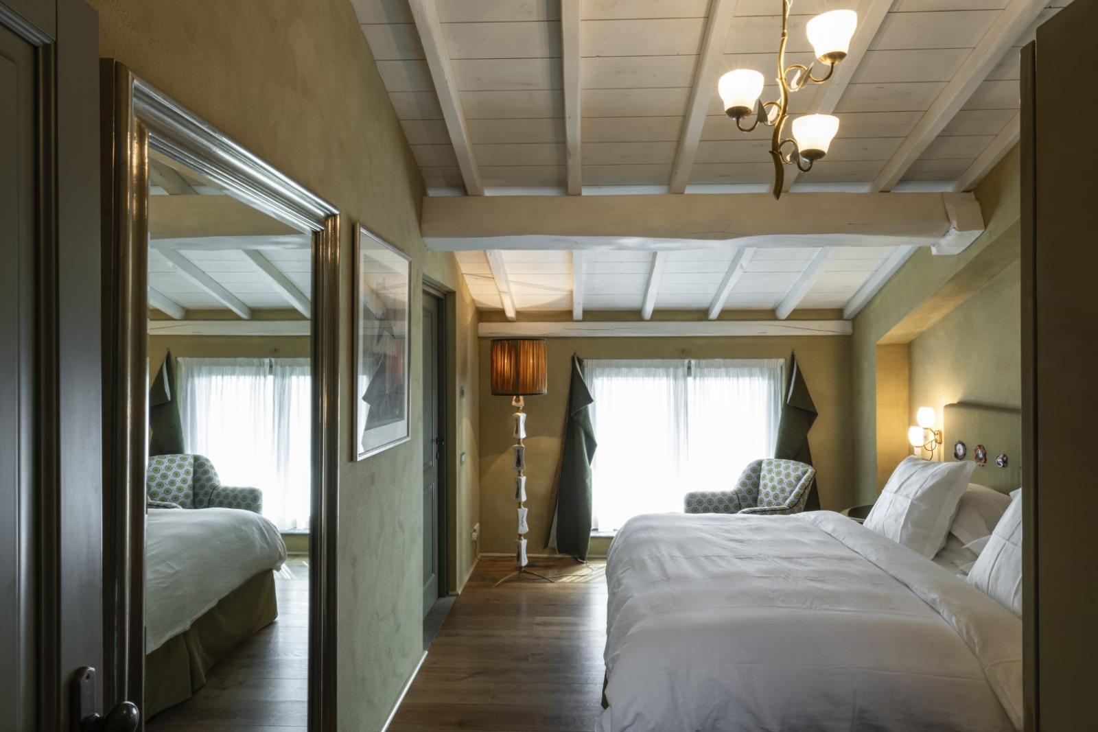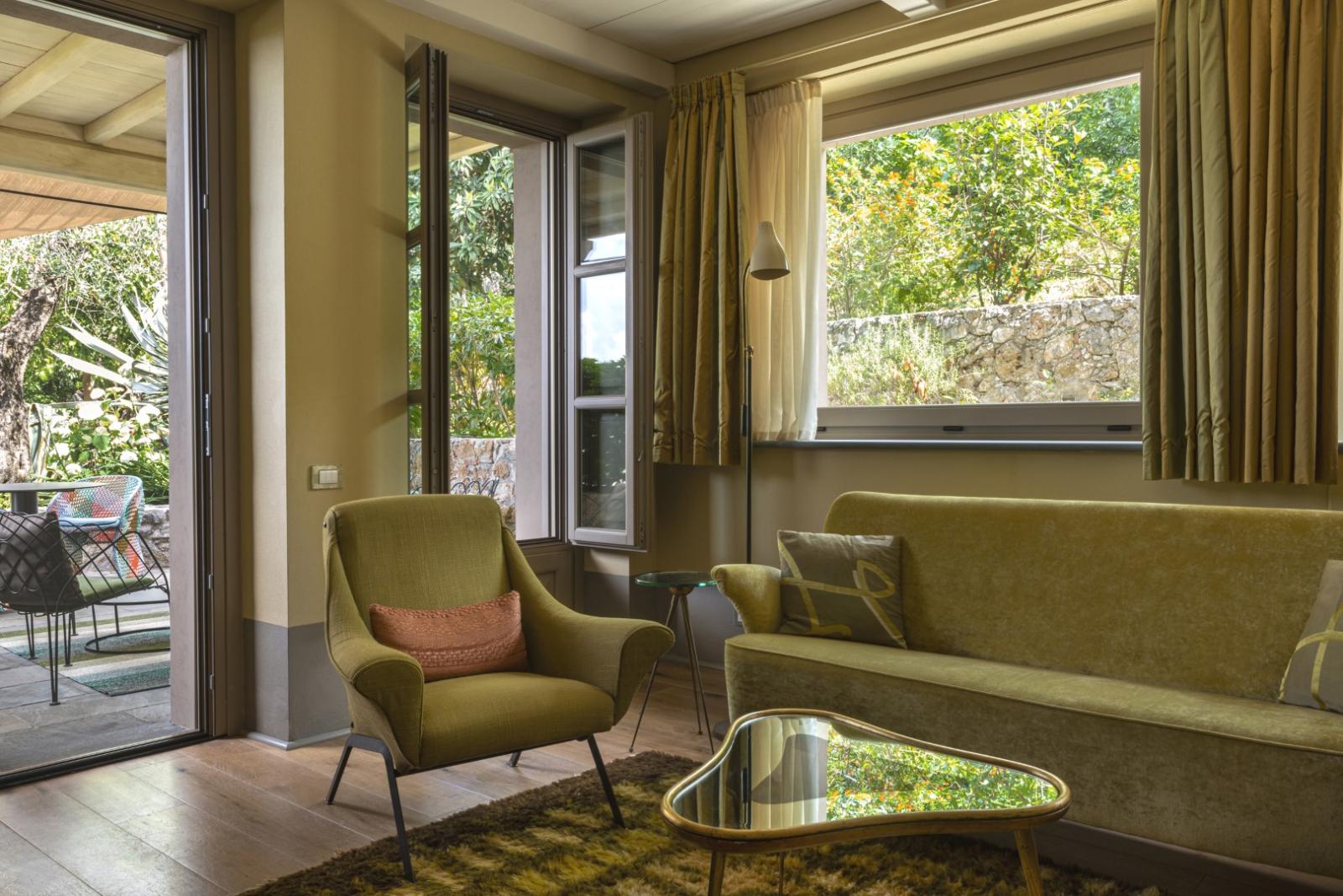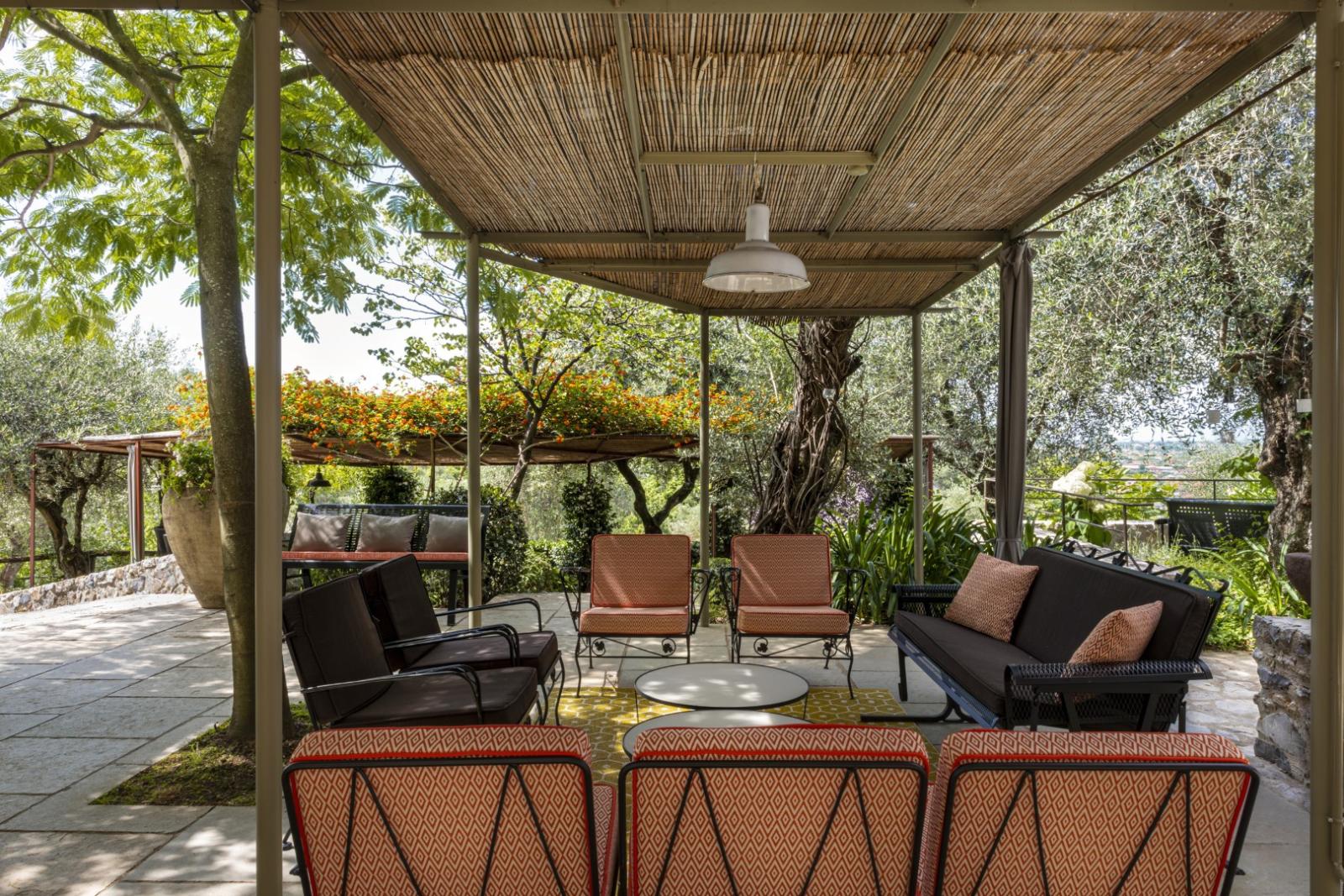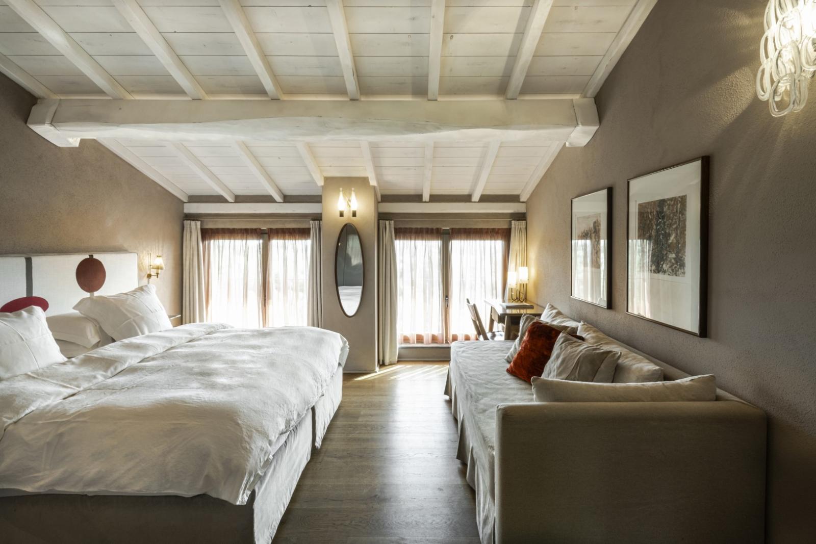 Elle compte 12 chambres et suites, toutes meublées avec goût et caractère, alliant design contemporain, art et pièces anciennes. Les espaces communs comprennent des salons avec cheminée, des terrasses panoramiques, des jardins méditerranéens et une piscine d'eau salée chauffée entourée d'oliviers.