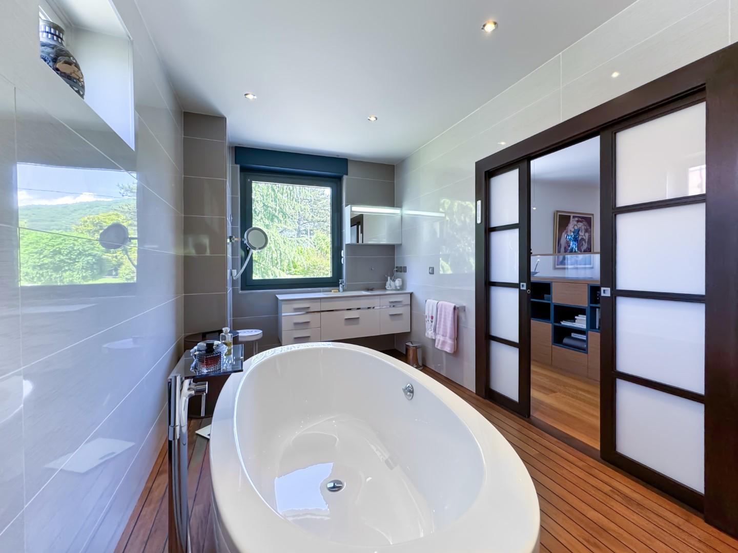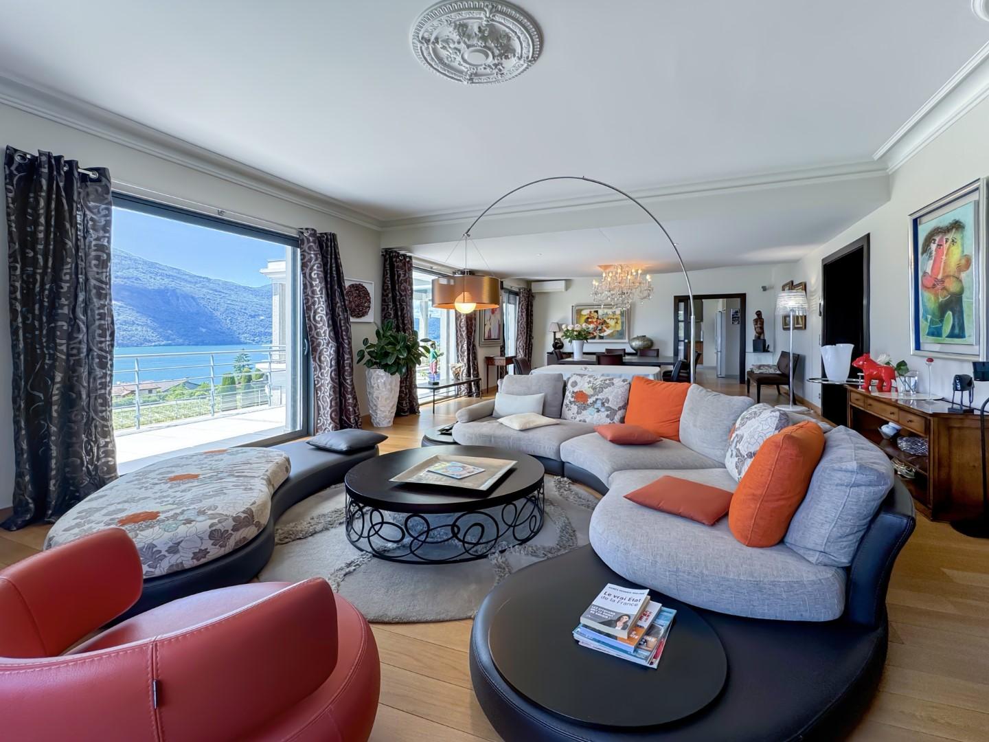 Le rez-de-chaussée propose un vaste séjour de plus de 60 m² s’ouvrant sur une immense terrasse avec panorama sur le lac, une cuisine indépendante, un bureau ainsi qu’une somptueuse suite parentale avec dressing et salle de bains.