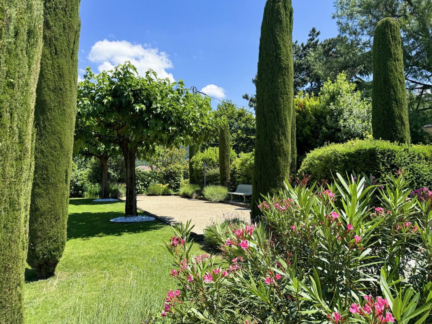 Le parc paysager de plus de 2 500 m², entièrement clos, invite à la sérénité avec ses différents espaces de détente soigneusement aménagés.