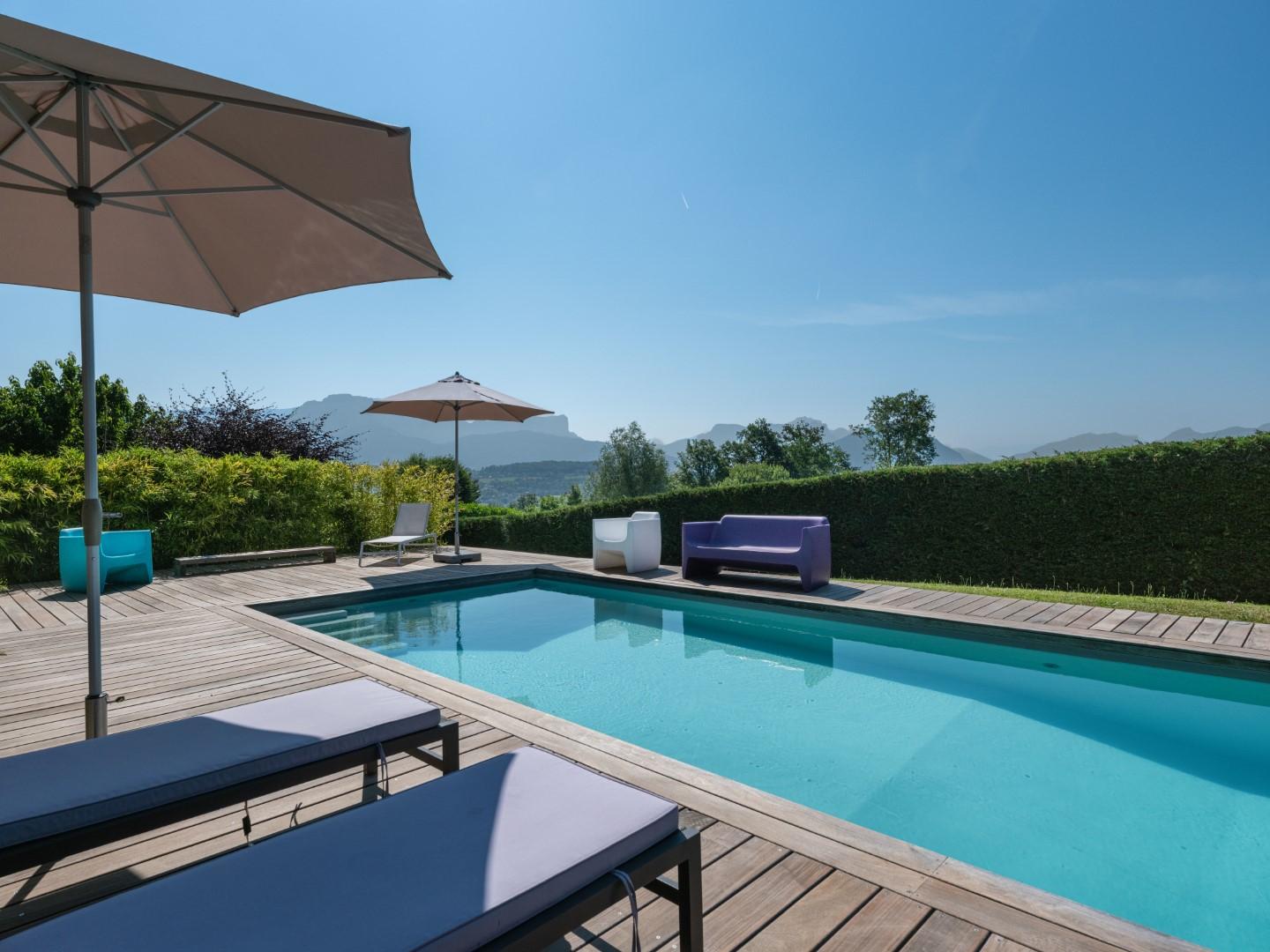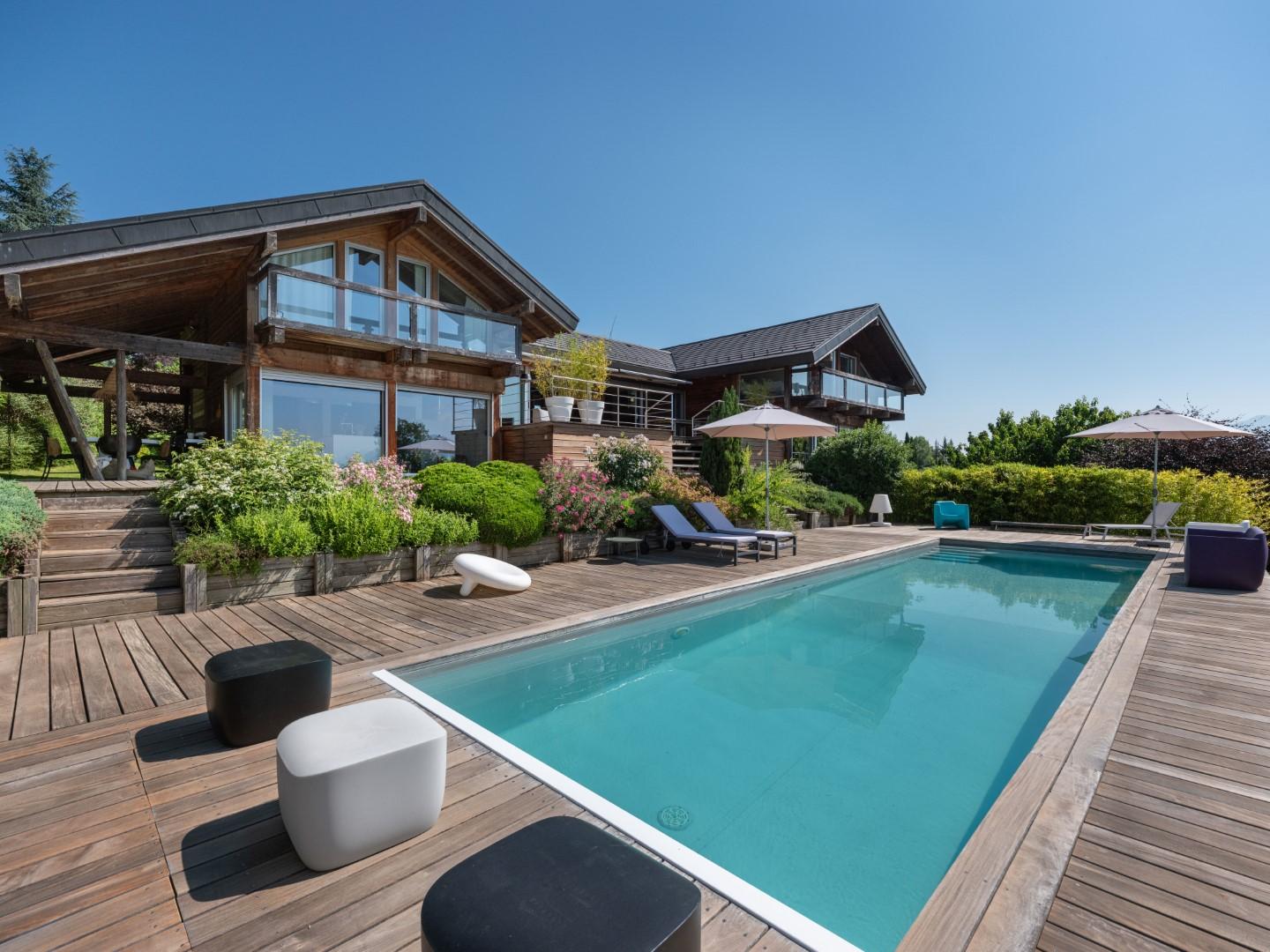 À l’extérieur, la parcelle paysagée s’articule autour d’une piscine chauffée de 13 x 3,5 m avec volet roulant intégré. Les espaces extérieurs — terrasses, balcons, zones de détente — permettent de profiter pleinement de l’ensoleillement et de la vue imprenable tout au long de la journée.