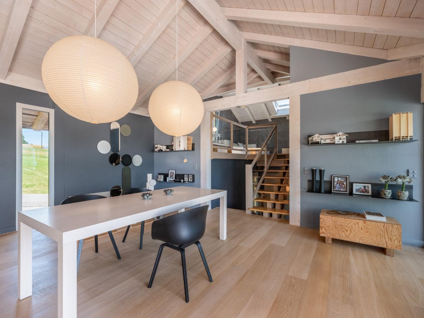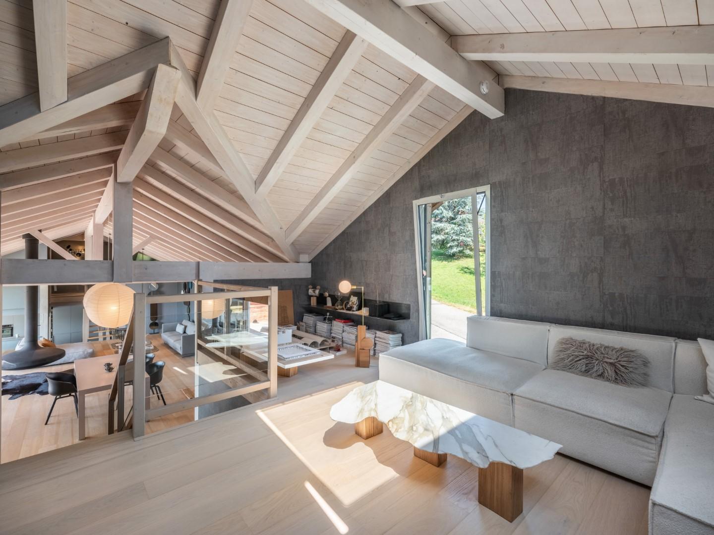 L’espace de vie cathédrale, aux volumes impressionnants, se prolonge vers l’extérieur avec une terrasse plein ciel de 60 m².
