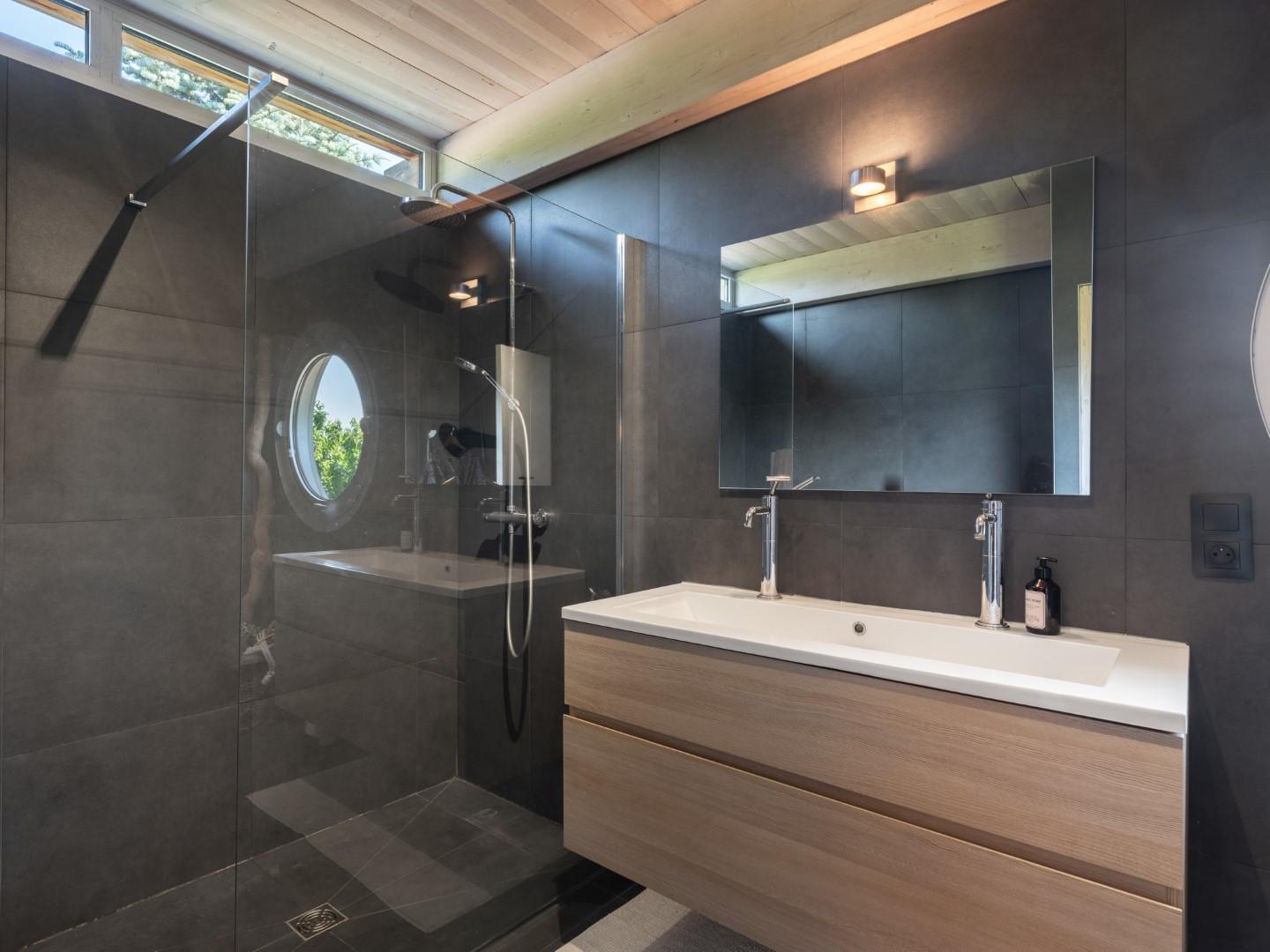À l’étage, une mezzanine accueille un salon TV ouvert sur la pièce de vie, ainsi qu’une superbe suite parentale avec balcon privatif, dressing, et salle de bain ouverte (baignoire, double douche, WC) offrent un espace nuit confortable et élégant.