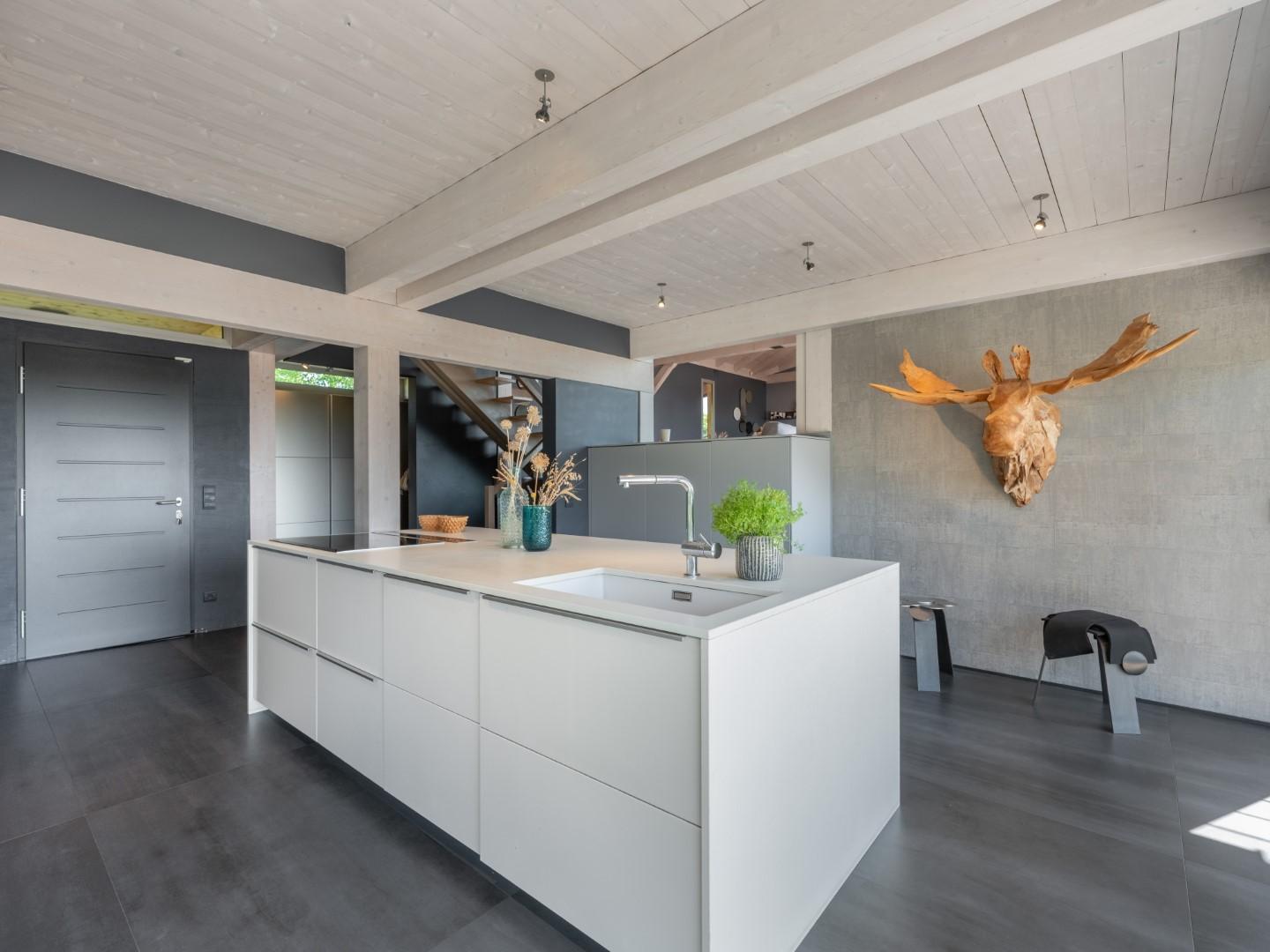 La cuisine équipée s’ouvre sur une grande terrasse abritée, parfaite pour les repas d’été.