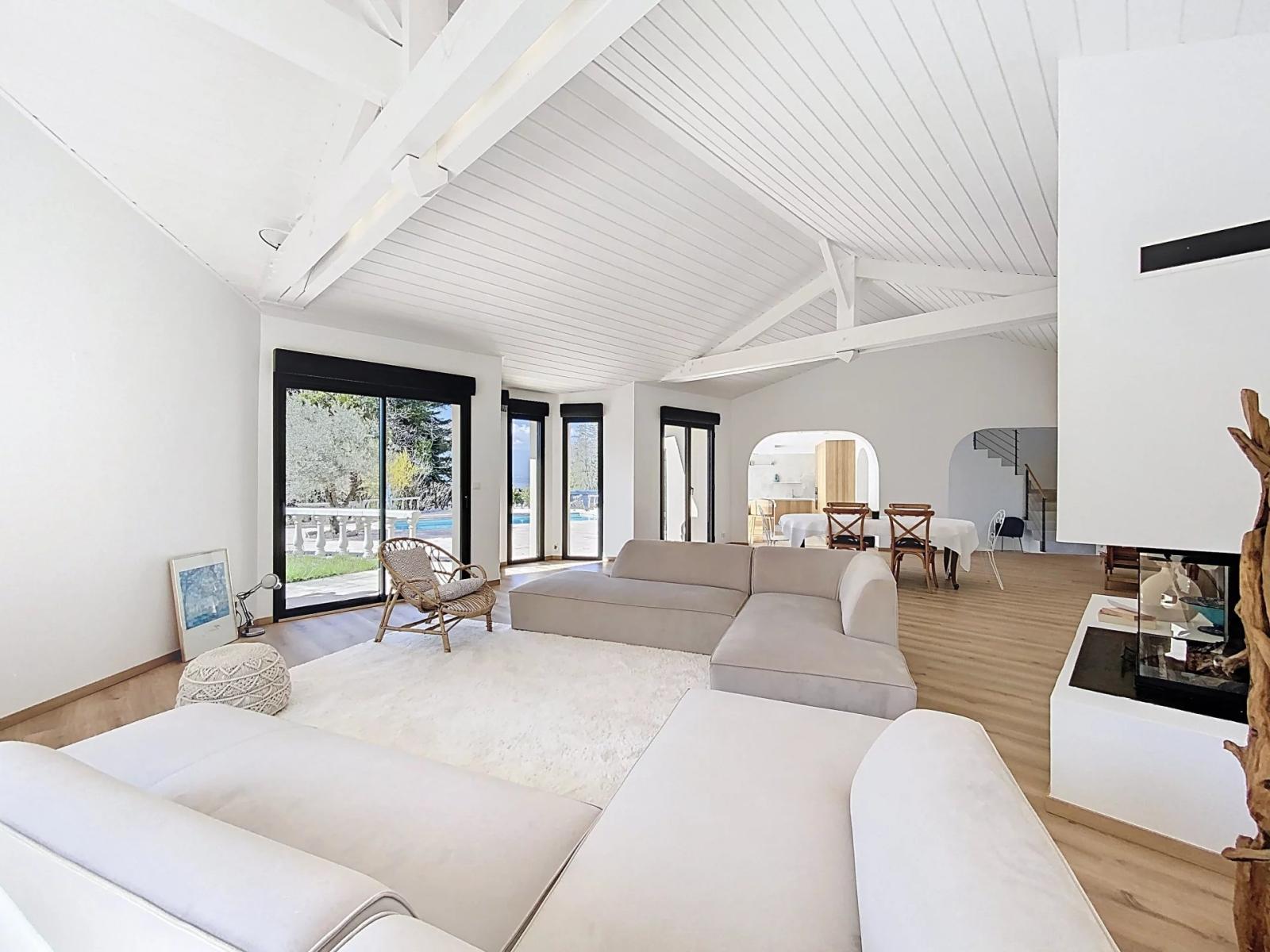 Le rez-de-chaussée offre un bel espace de vie d’environ 95 m² comprenant un salon et une cuisine ouverte avec vue sur le lac.