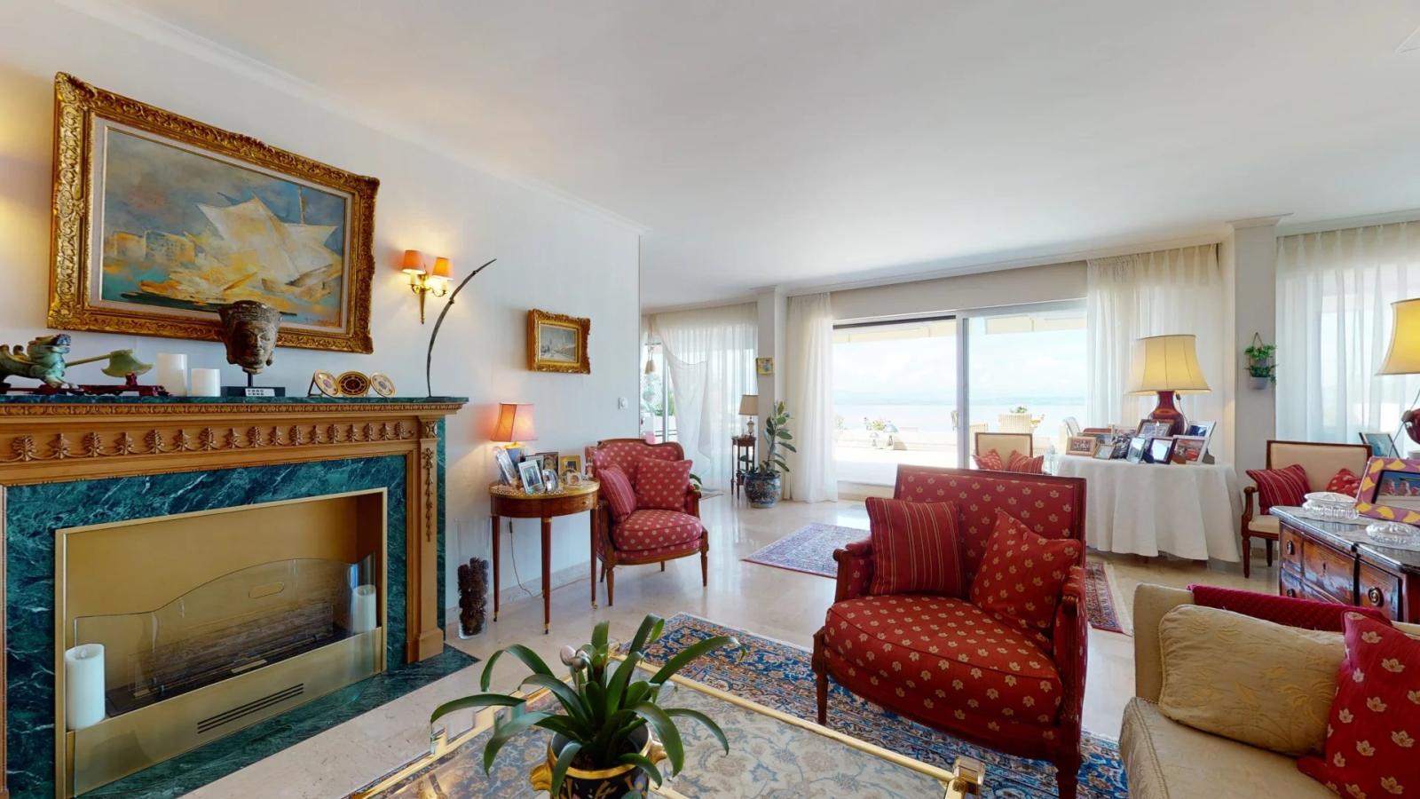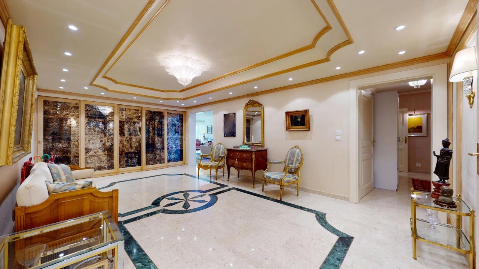 L'appartement se compose d'un vaste hall d'entrée, d'une double pièce de réception, d'une cuisine agencée avec vino cave, ouvrant sur la salle à manger.