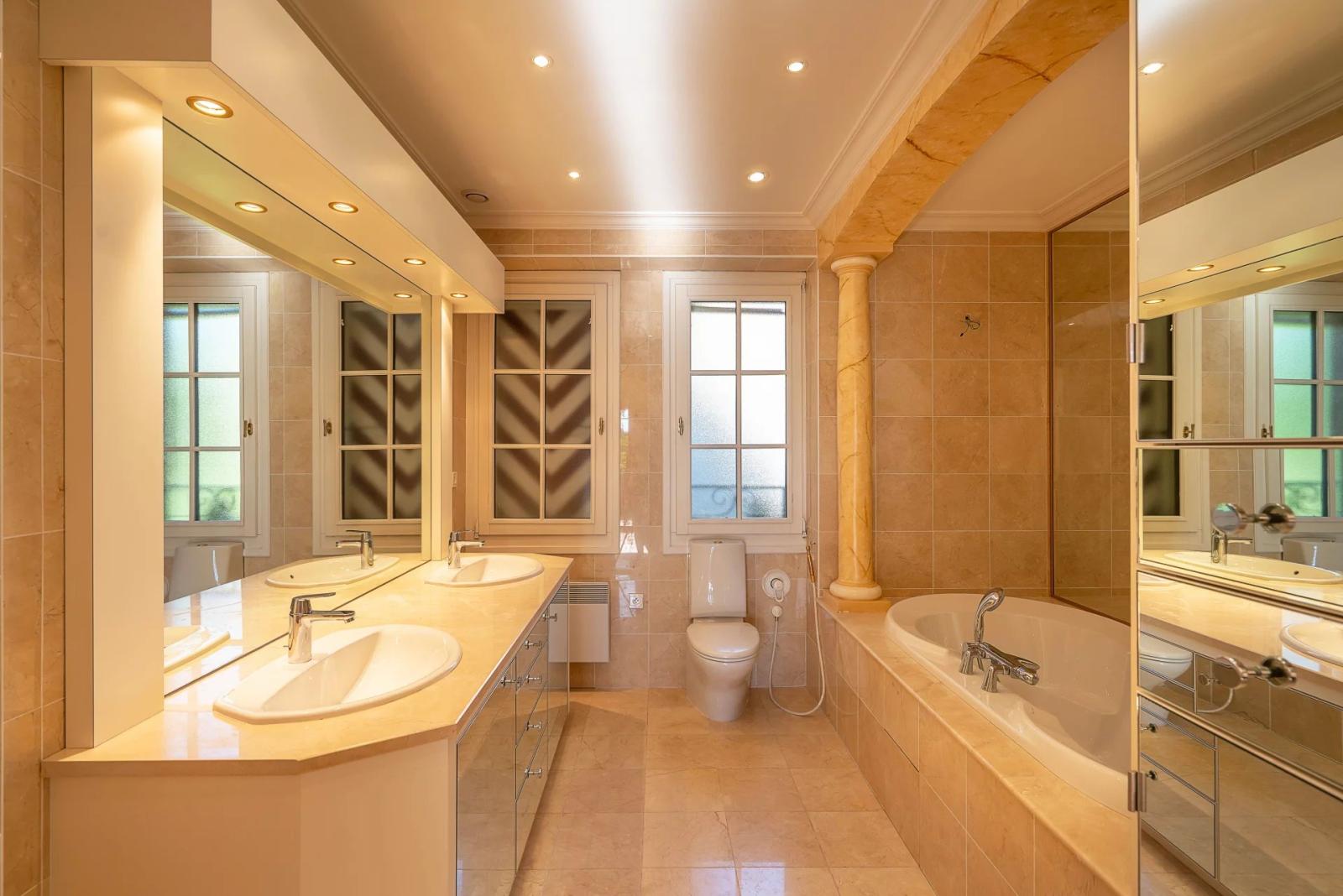 Il comprend une salle à manger, un salon chaleureux avec cheminée, ainsi qu’une suite parentale orientée sud, dotée d’un dressing et d’une salle de bains en marbre avec baignoire, douche et balcon donnant sur un jardin d'exception.