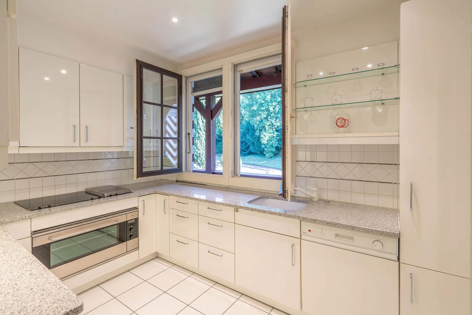 Trois autres chambres avec vue sur le lac, une salle d’eau, un espace bureau orienté sud, ainsi qu’une belle cuisine ouverte sur le jardin complètent cet espace de vie.