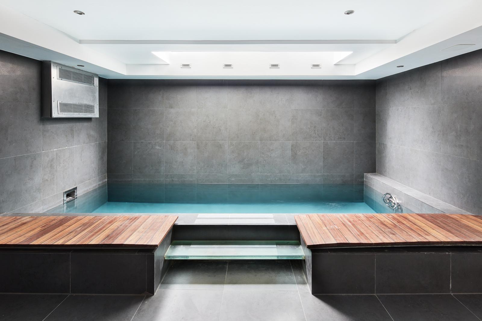 On the lower-ground floor, a skylit swimming pool and sauna create a luxurious subterranean retreat.