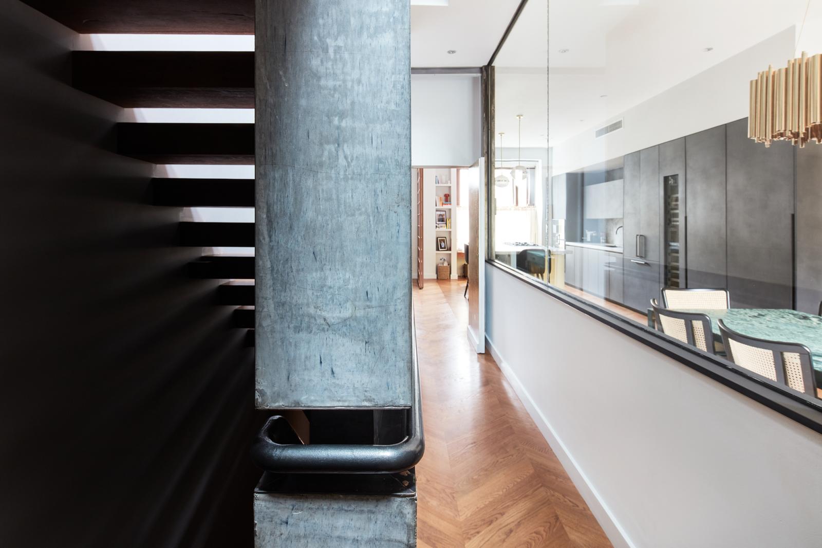 The principal bedroom suite occupies the third floor, with a considered palette of wood, metal and stone, alongside a private south-facing balcony.