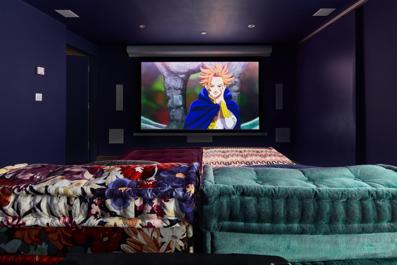 The home features playful accents and industrial elements including reclaimed theatre doors and a striking gold wall with Aztec detailing.