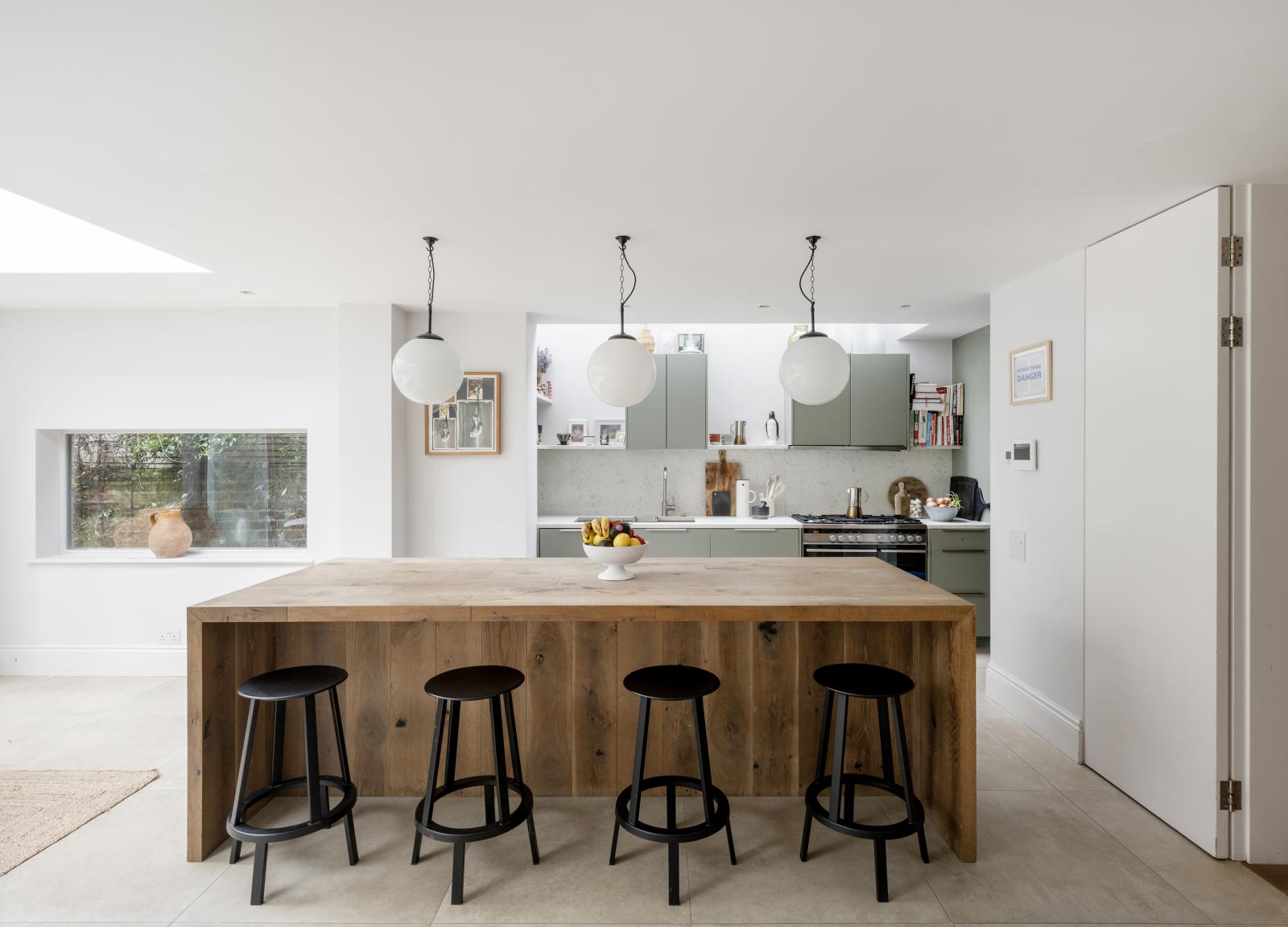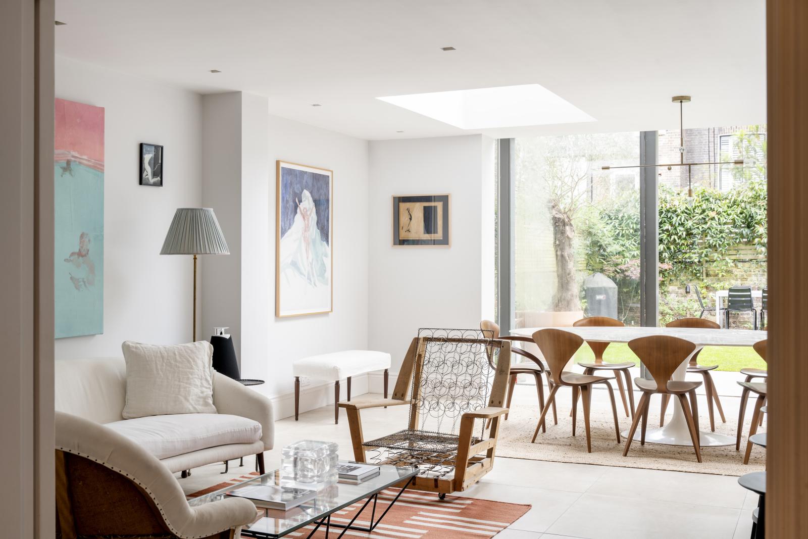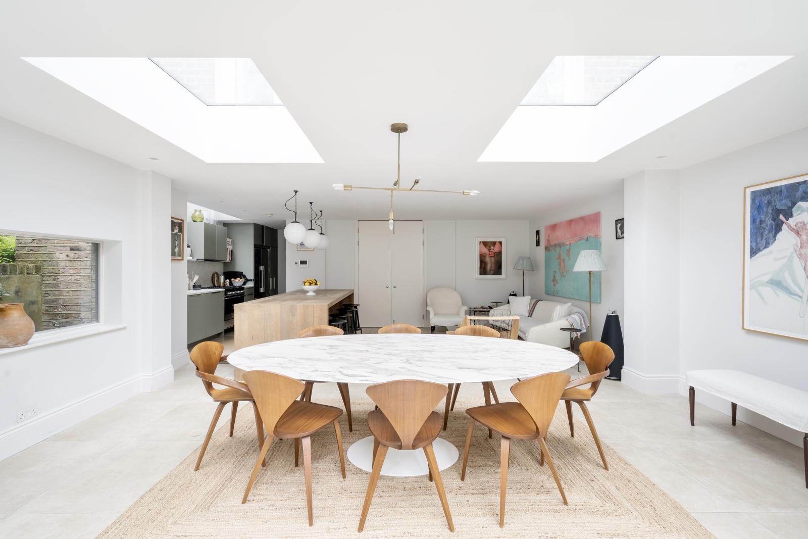 Inside, the open-plan reception space flows seamlessly across the ground floor, with living areas surrounding a central glazed void that directs soft, north-facing light to the lower level.