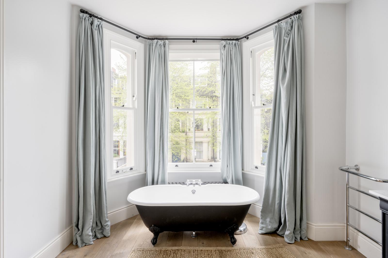 The kitchen is a refined mix of grey cabinetry and integrated Siemens appliances, while Juliet balconies open to create a connection between indoor and outdoor living.