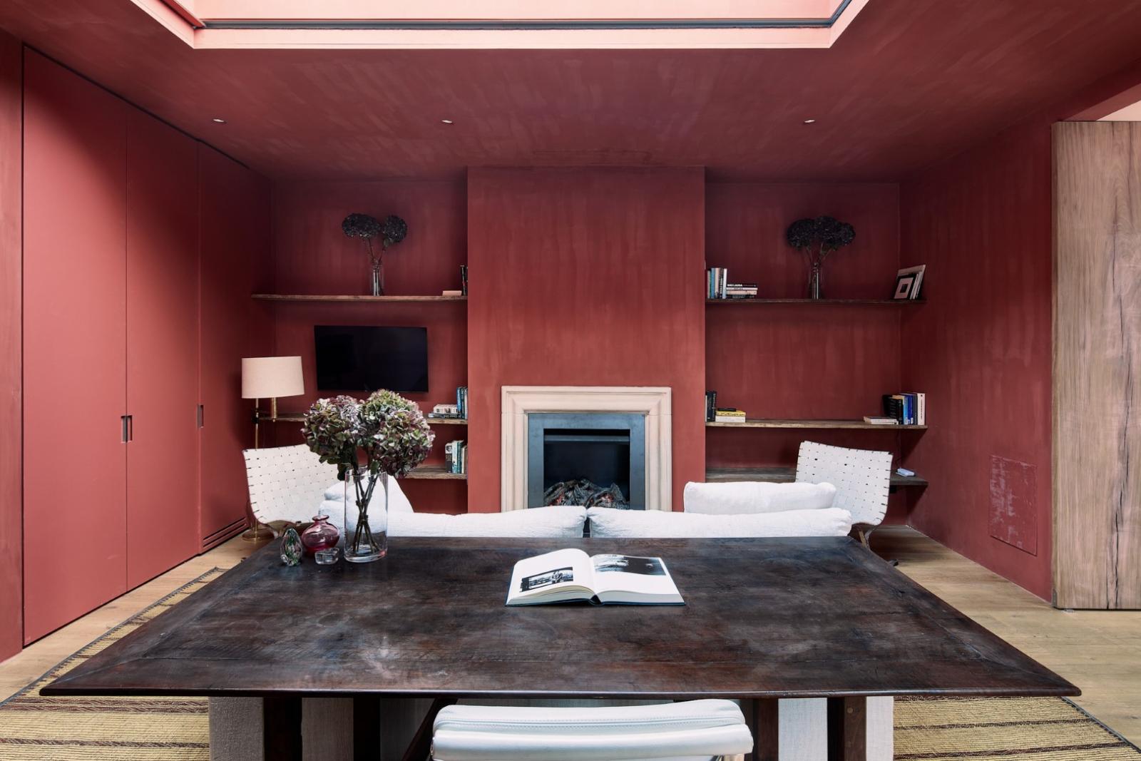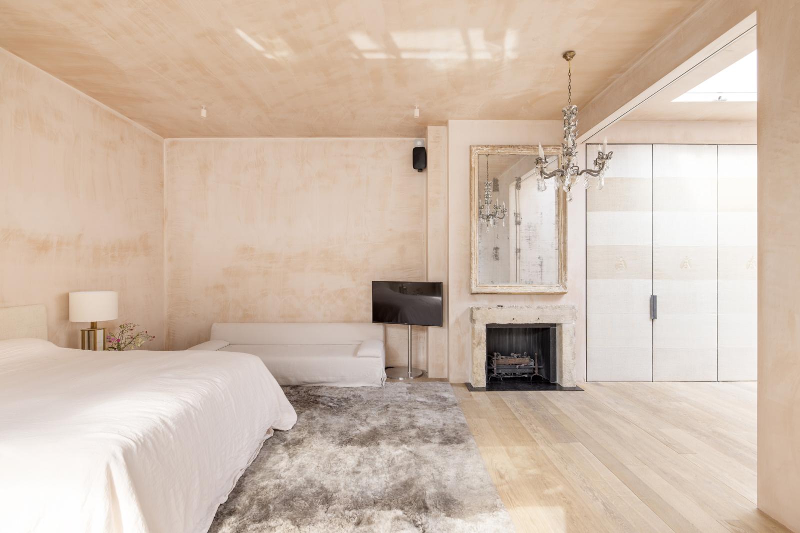 On the first floor, the principal bedroom features pink plaster walls, a dedicated dressing room, and a luxurious ensuite with a freestanding tub and walk-in shower.