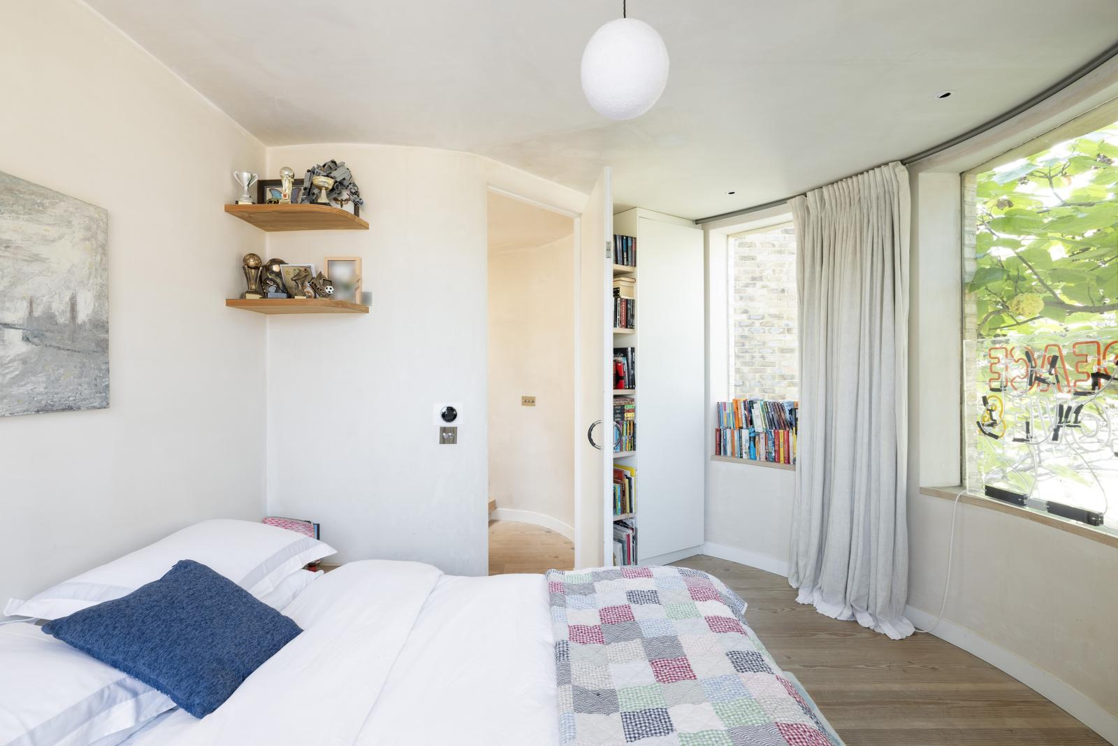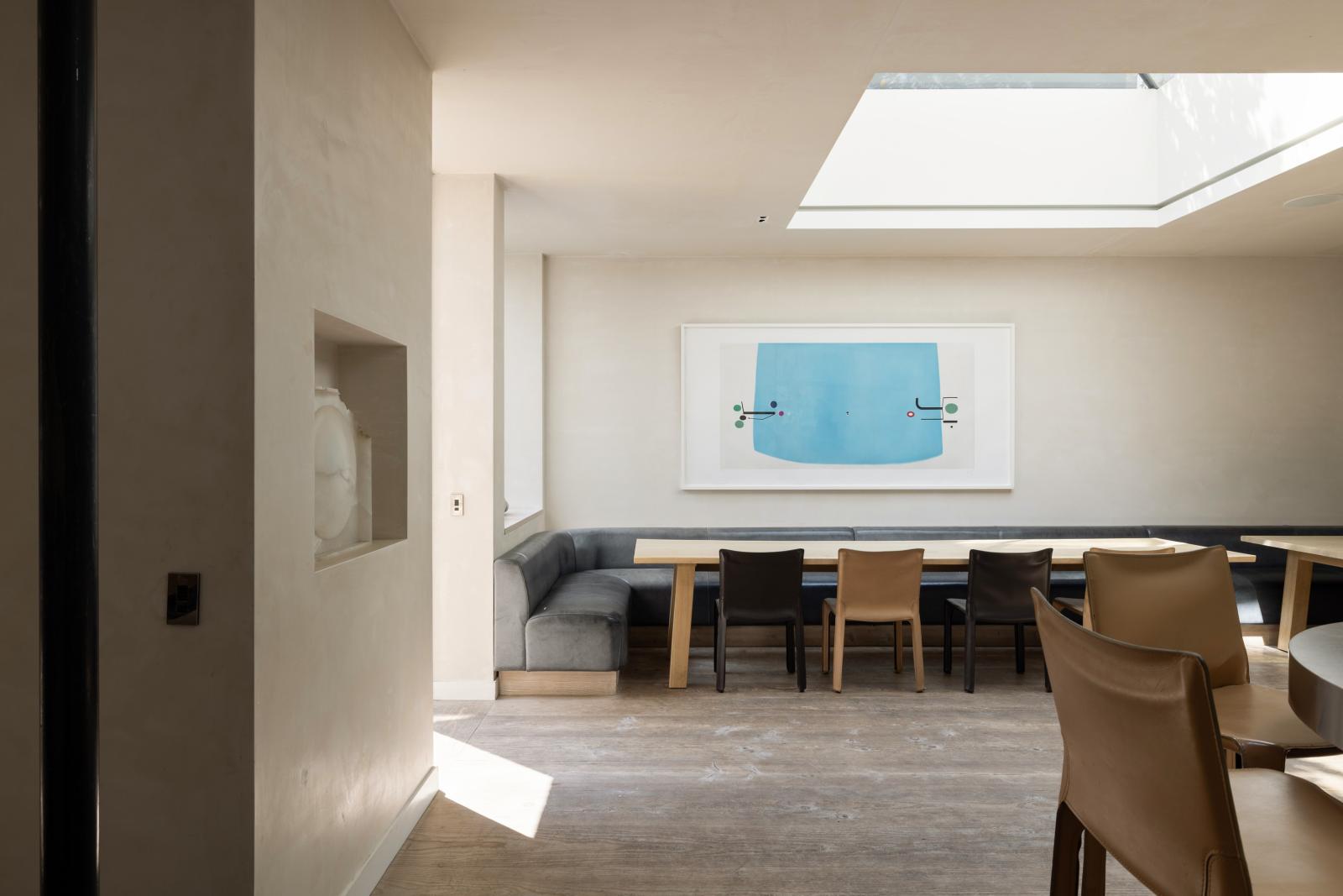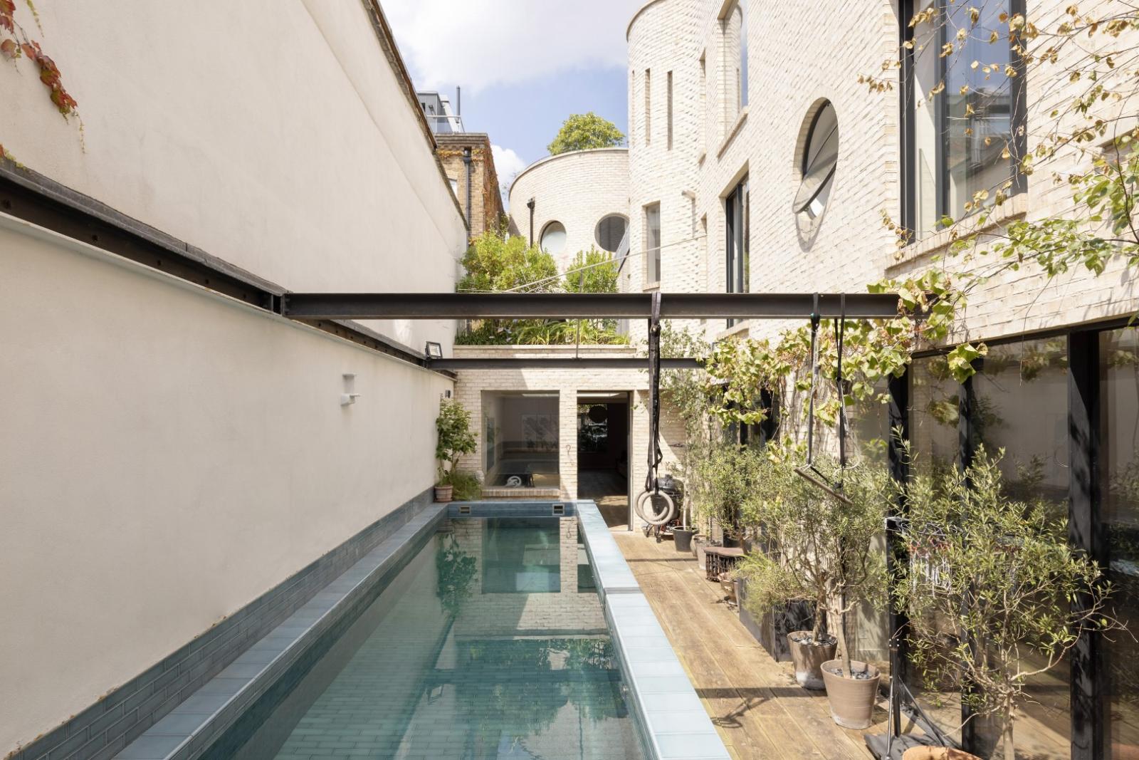 Adjacent, a calming reception room with a wood burner overlooks the courtyard garden and pool, while a hidden home office offers privacy. Upstairs, natural light and soft curves define the spaces.