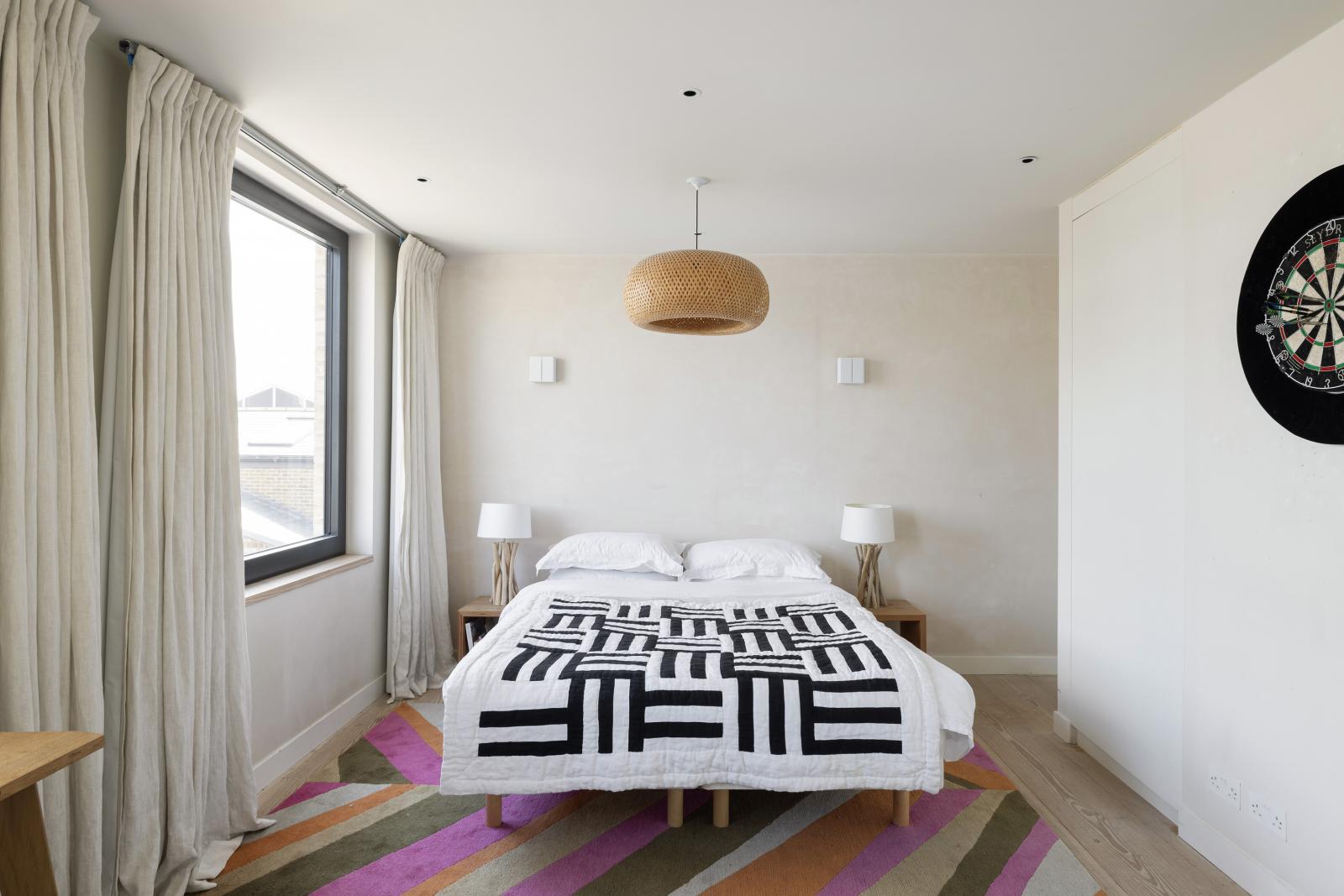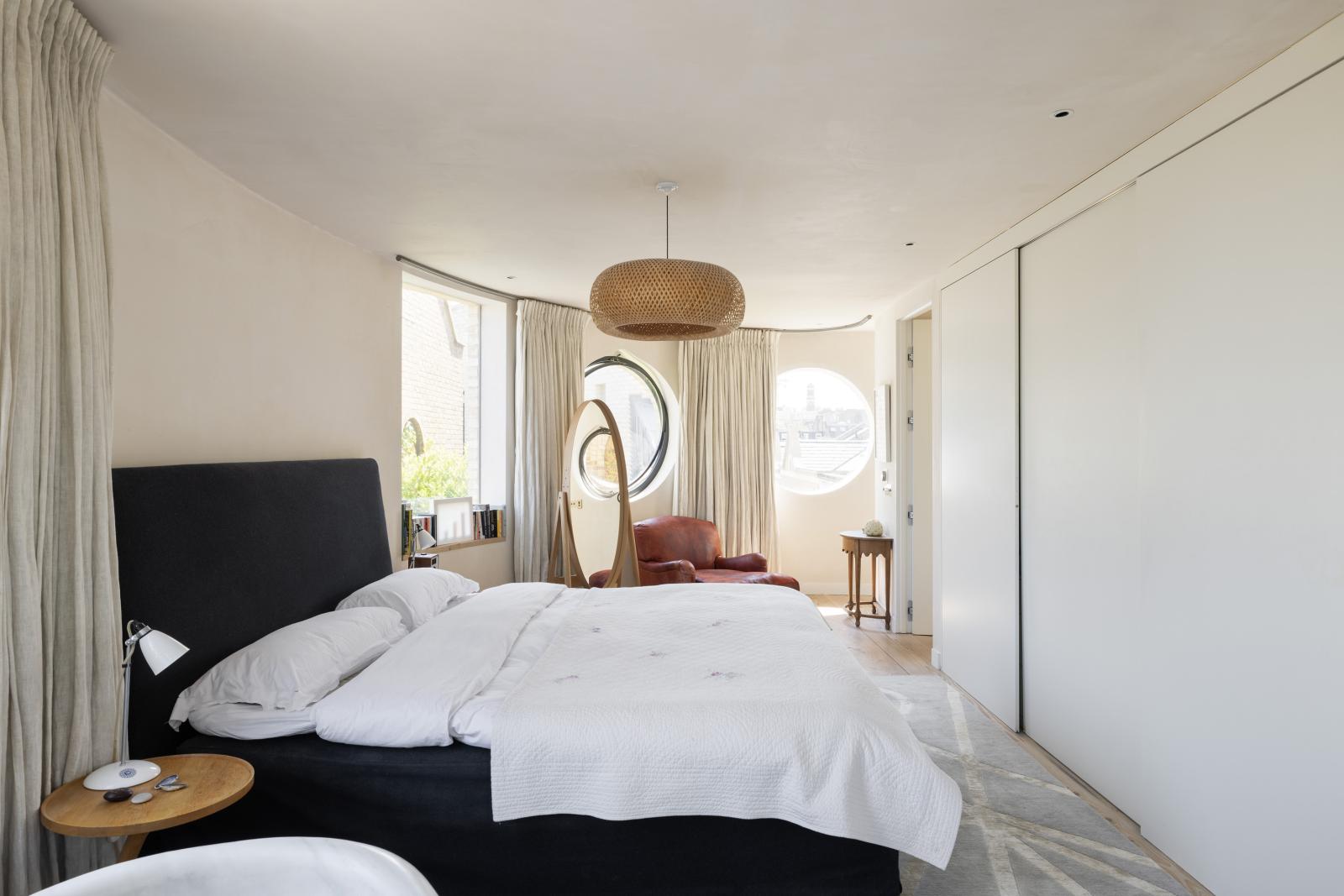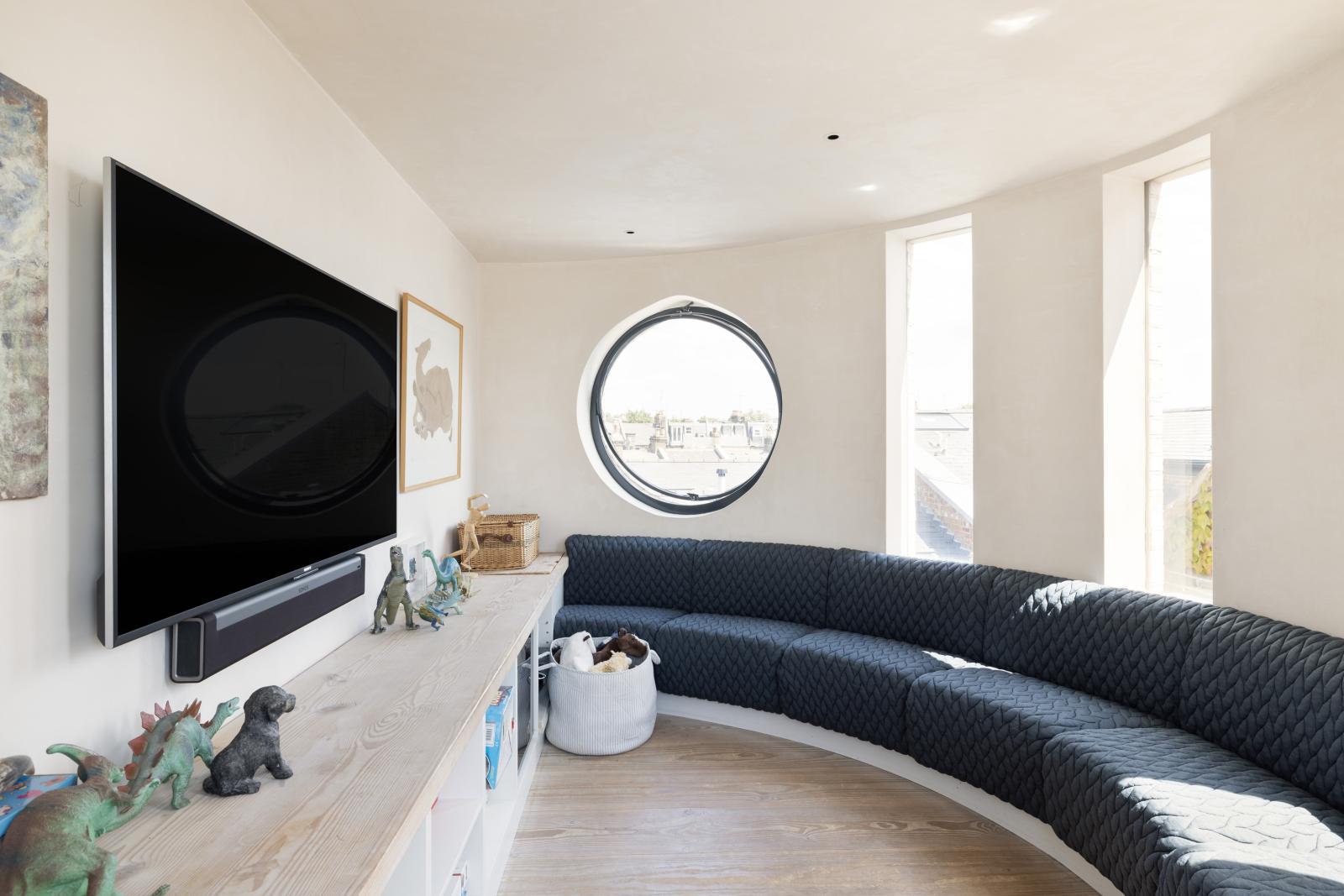Adjacent, a calming reception room with a wood burner overlooks the courtyard garden and pool, while a hidden home office offers privacy. Upstairs, natural light and soft curves define the spaces.