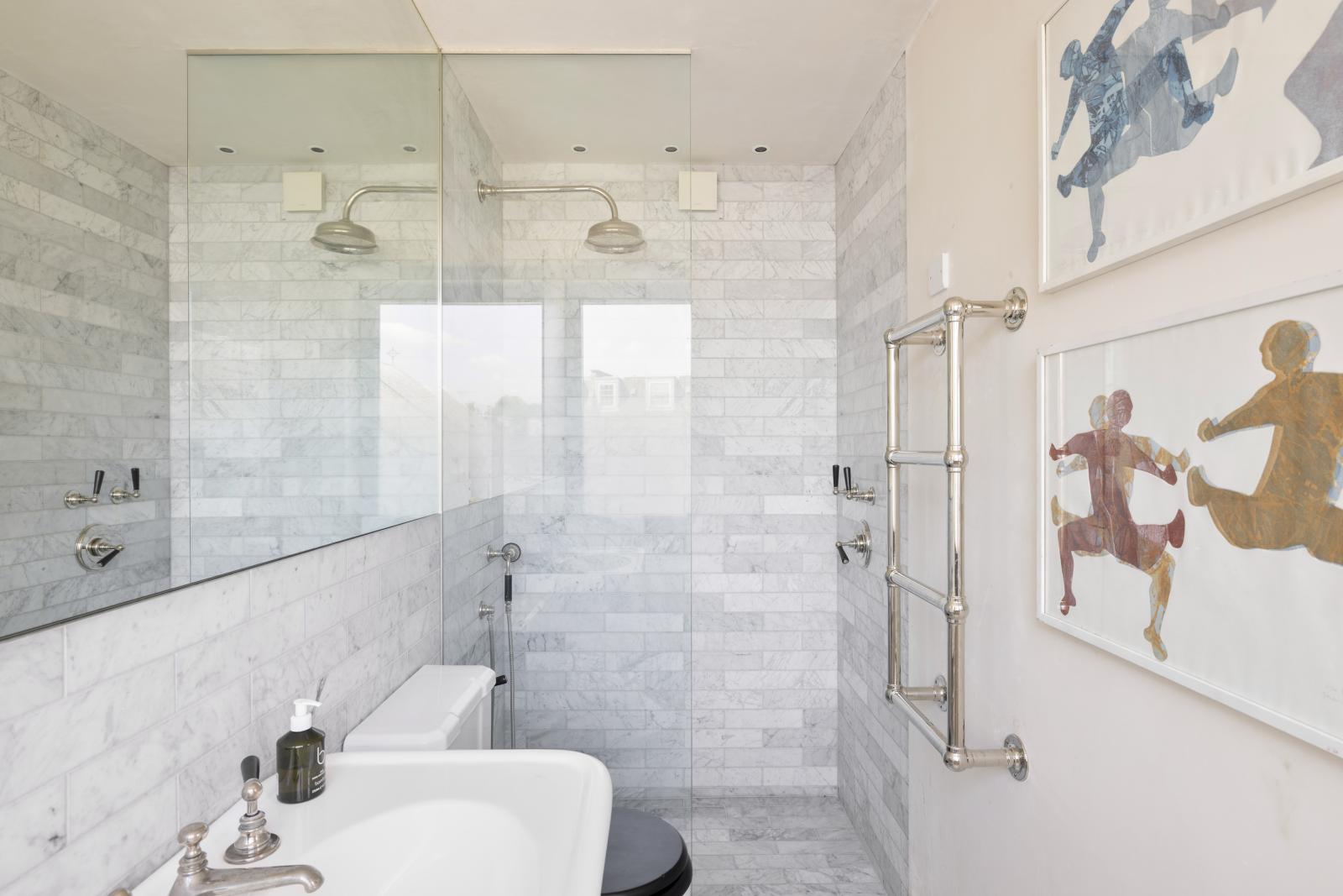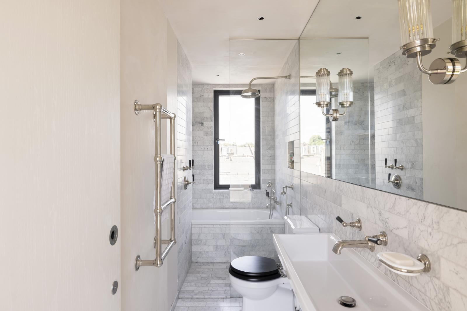 The principal suite features a rare marble-carved bathtub, while additional bedrooms and family bathrooms are finished in a minimalist palette of plaster walls and wide plank Dinesen floors.