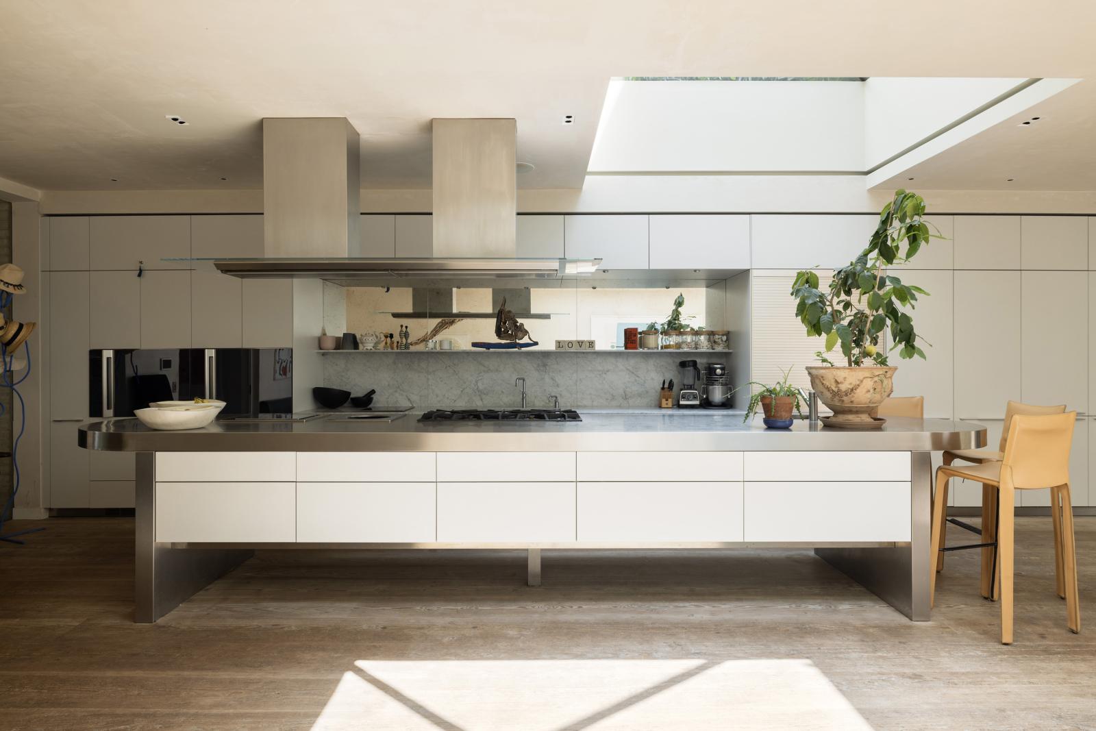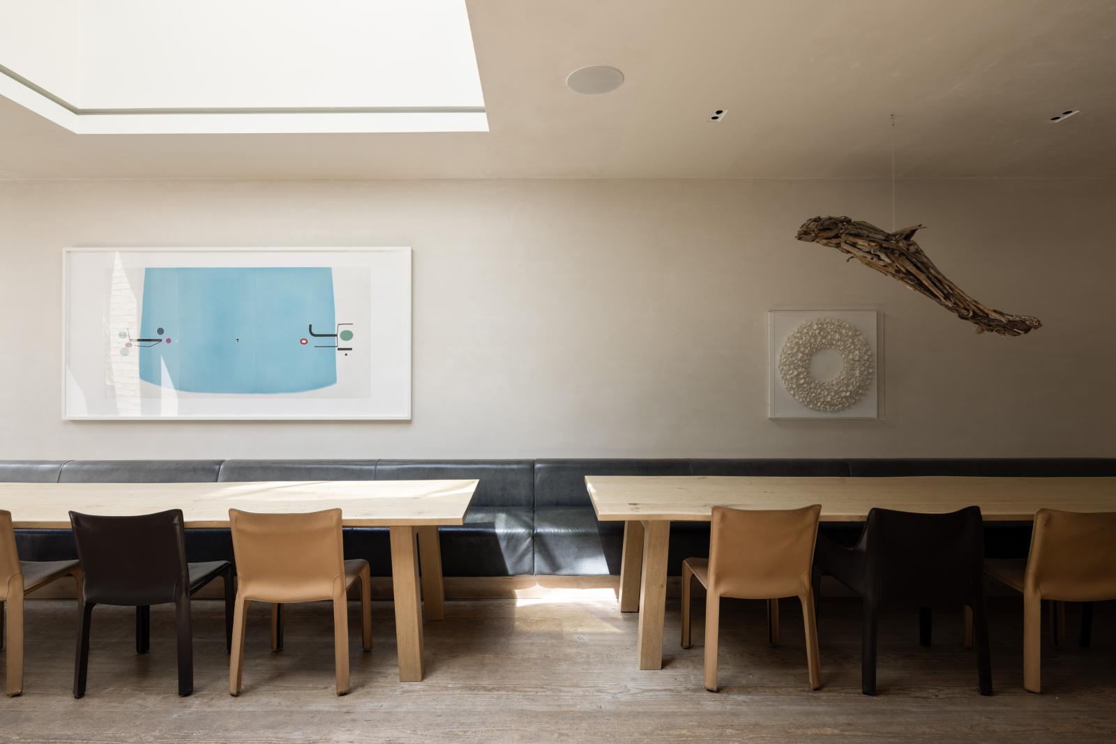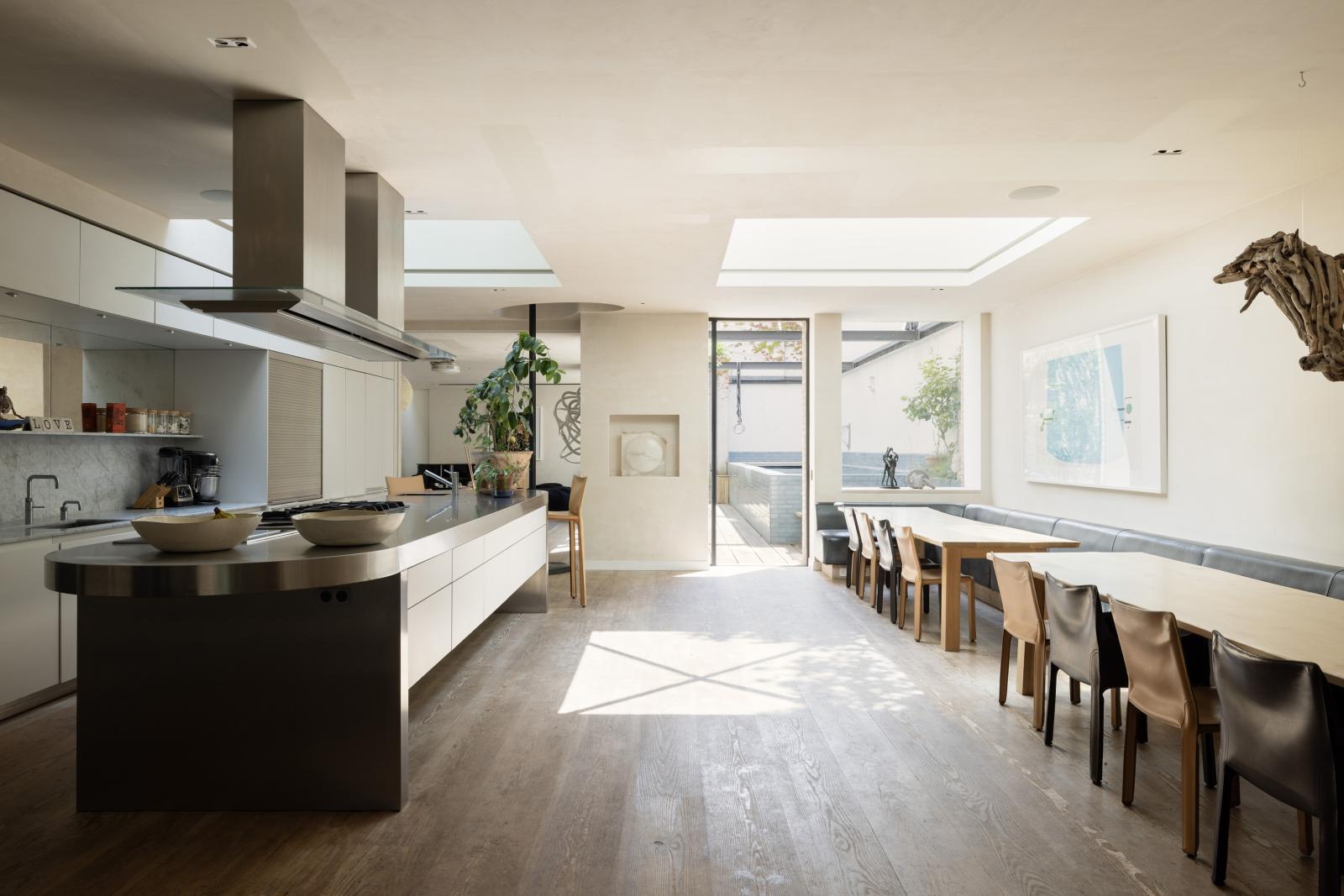 At its heart, a light-filled kitchen and dining room spans an entire wall of banquet seating and a five-metre Bulthaup island, equipped with professional-grade Electrolux appliances.