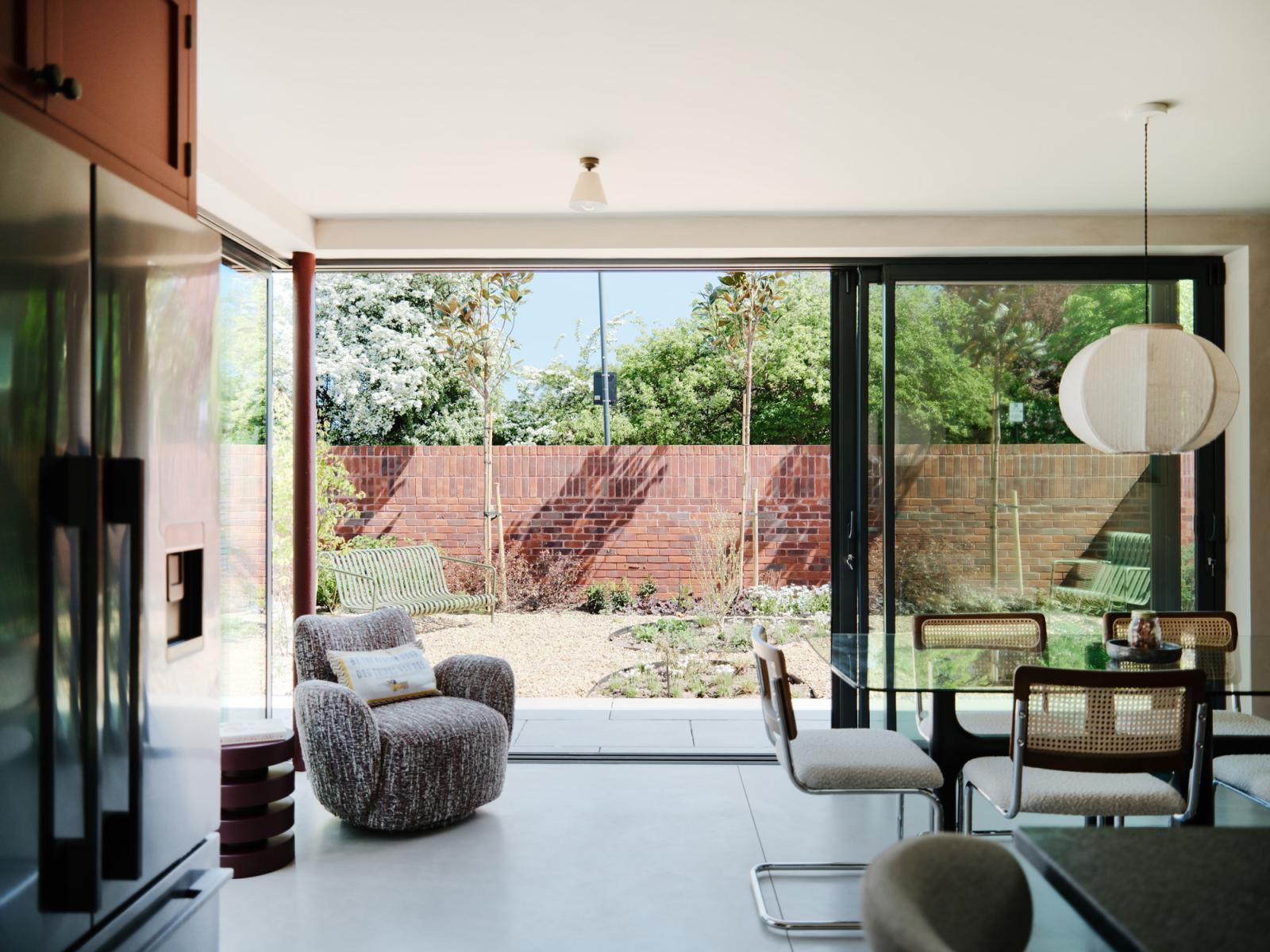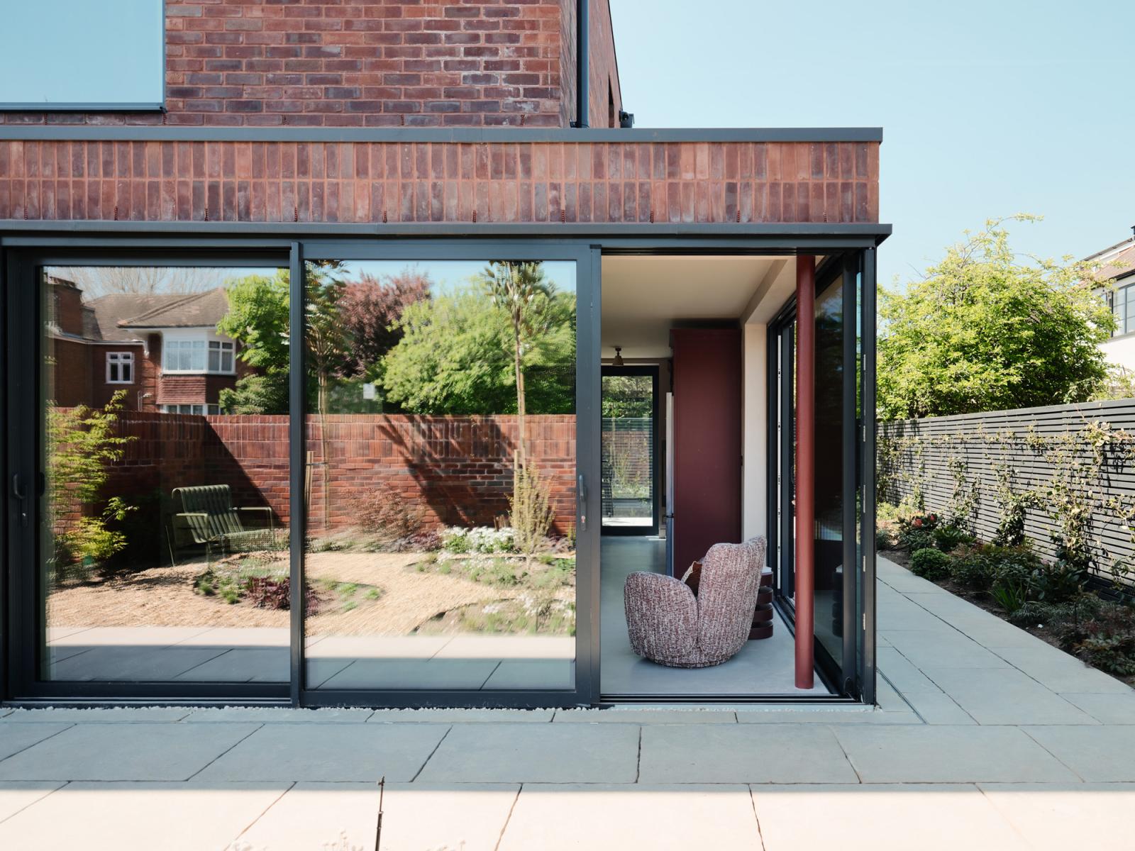 Glazing runs along the perimeter, opening to a landscaped garden.