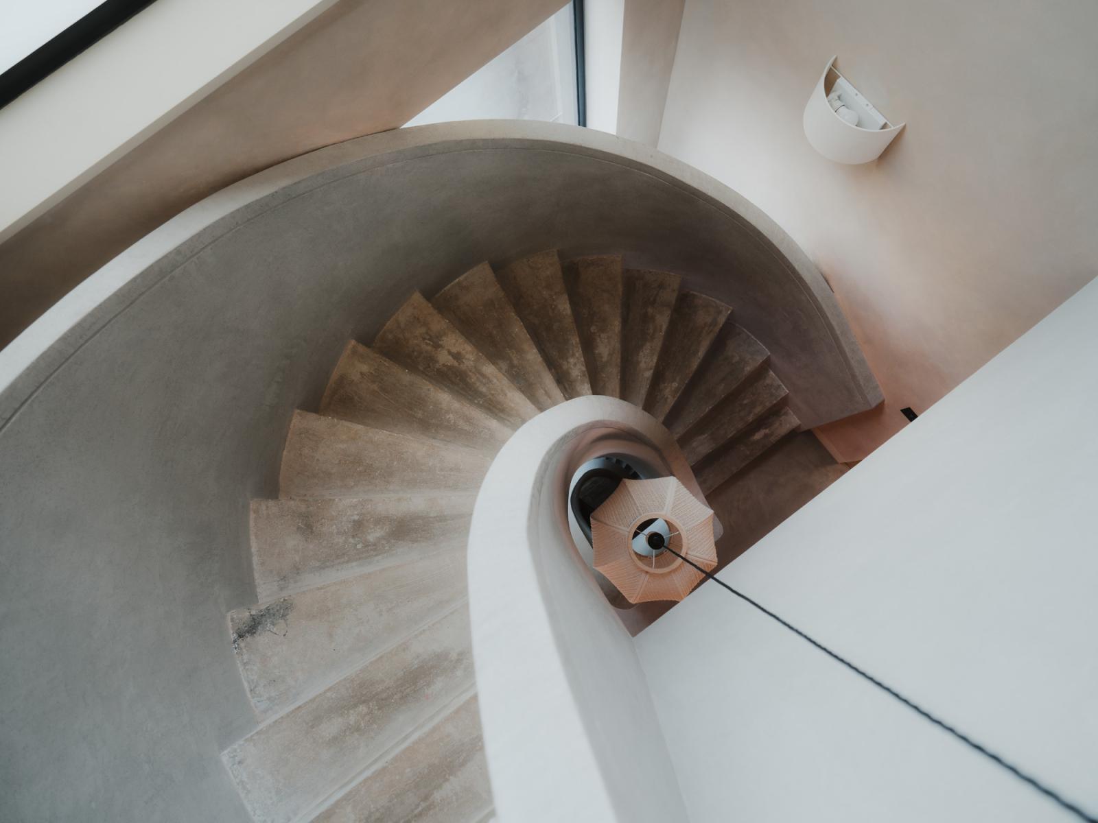 The sleek façade conceals expressive materials, starting with a striking curved concrete staircase.