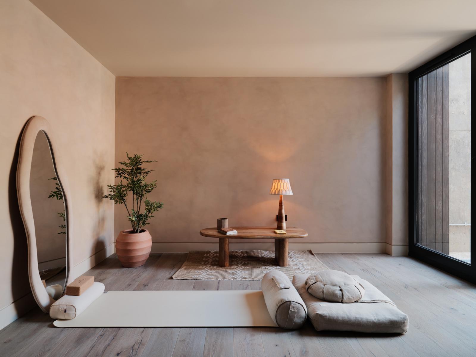 The living room opposite, with its Bauwerk limewash walls and floor-to-ceiling windows, maintains a light atmosphere.