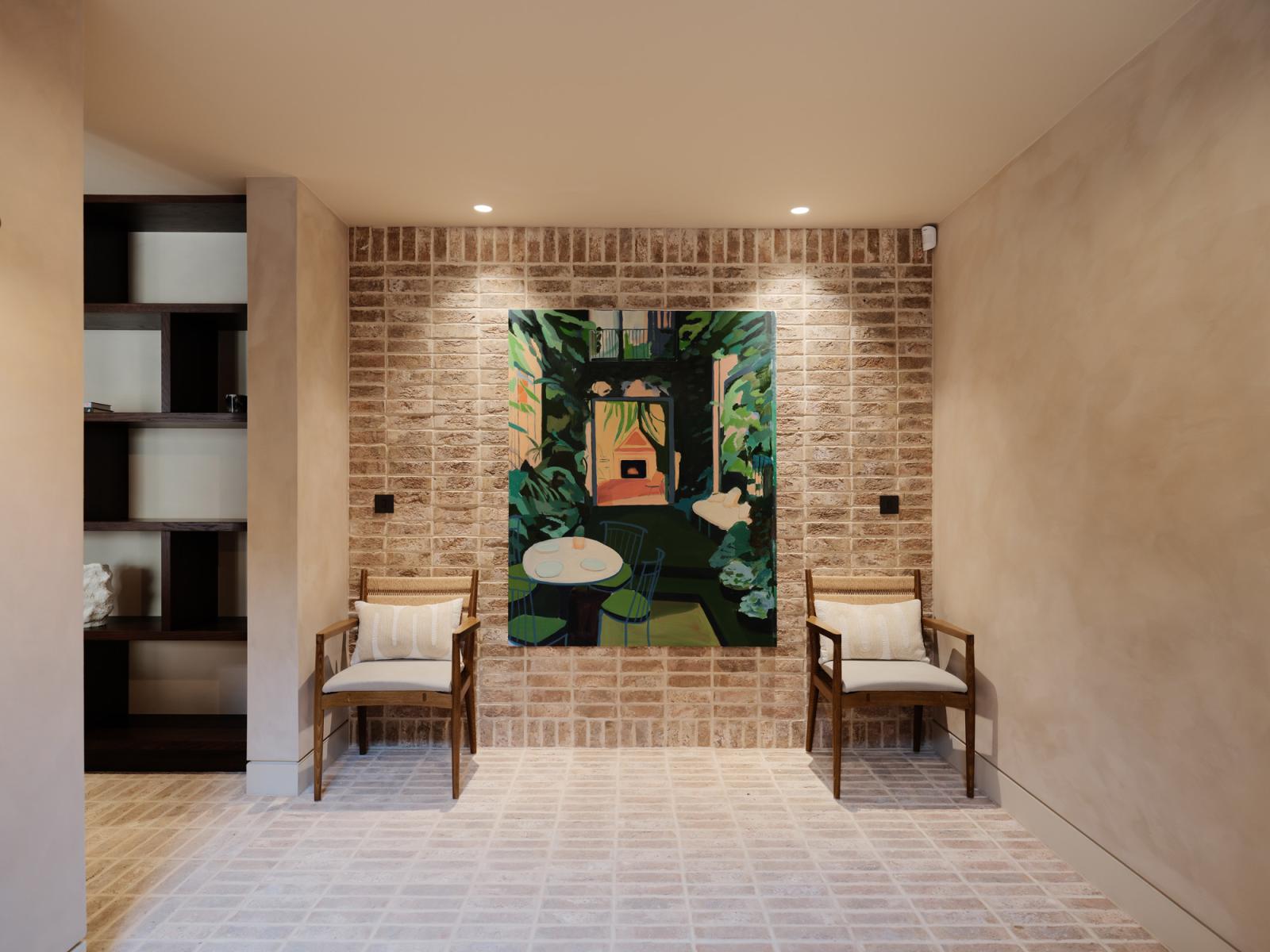 The lower ground floor opens into a generous hallway, with terracotta clay pavers and a bespoke library wall.