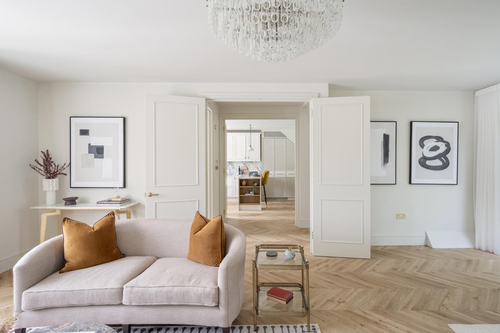 Adjacent, the open-plan kitchen and dining area fitted by London Kitchen Consultants is styled with Arabescato Corchia marble, deVOL tapware, and bespoke lighting.