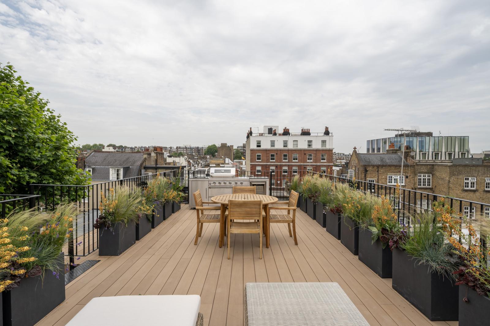 The home's standout feature is its expansive roof terrace with an outdoor kitchen, wooden decking, and black cast-iron fencing?a private oasis for al fresco entertaining and relaxation.