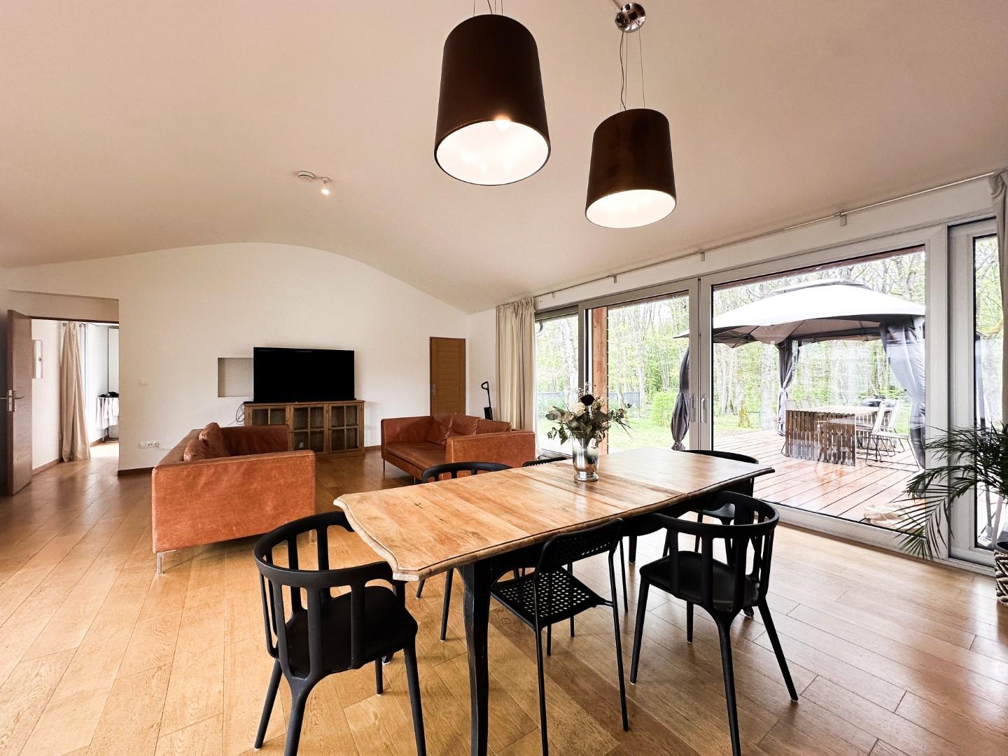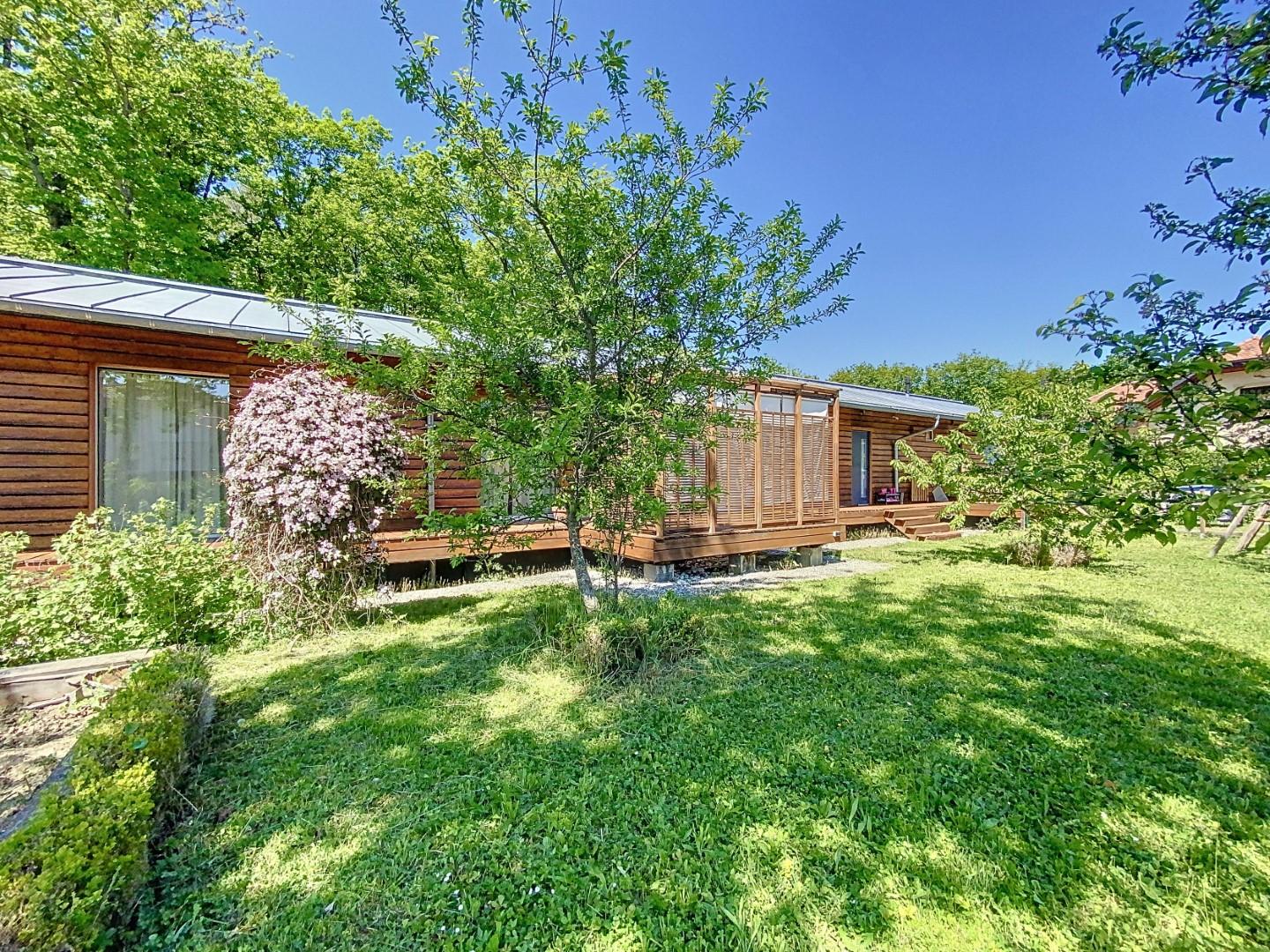 L'ensemble possède de très belles ouvertures sur les extérieurs dans l'esprit pavillon de méditation, avec un jardin clos et paysagé et une parcelle de bois dans la continuité du jardin (non constructible) pour un total de 4 540 m².