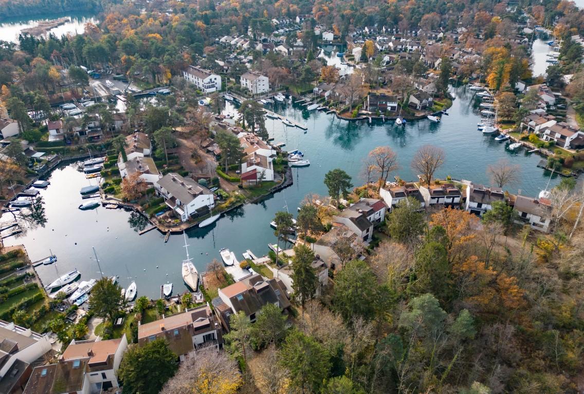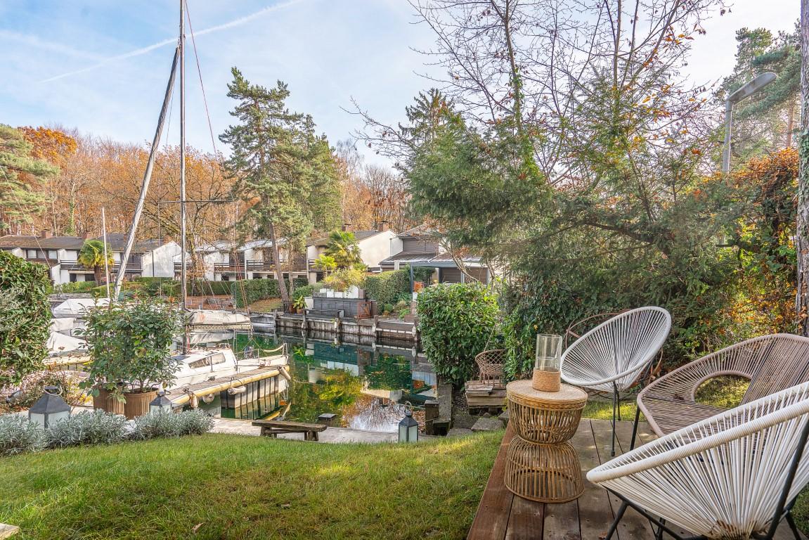 Entourée d’un jardin arboré, elle offre au rez-de-chaussée un espace de vie traversant comprenant séjour et cuisine, ouvert sur une terrasse avec vue directe sur les canaux.