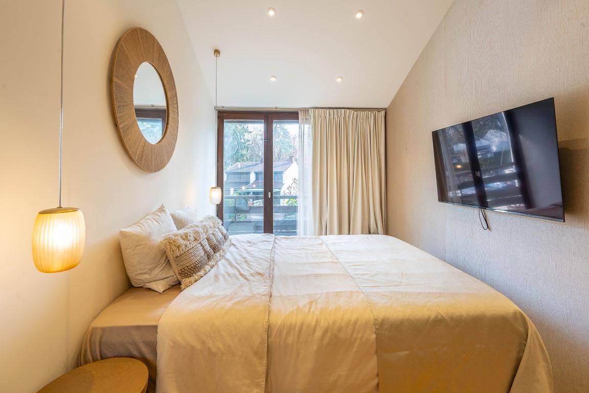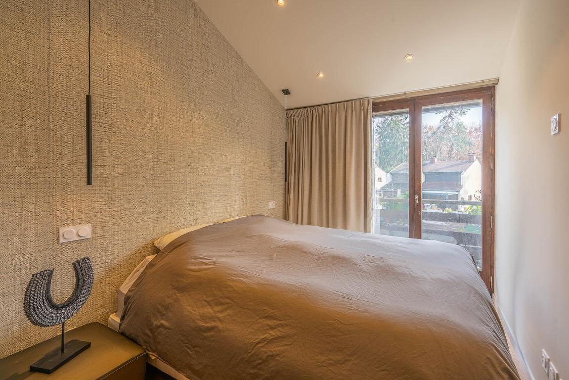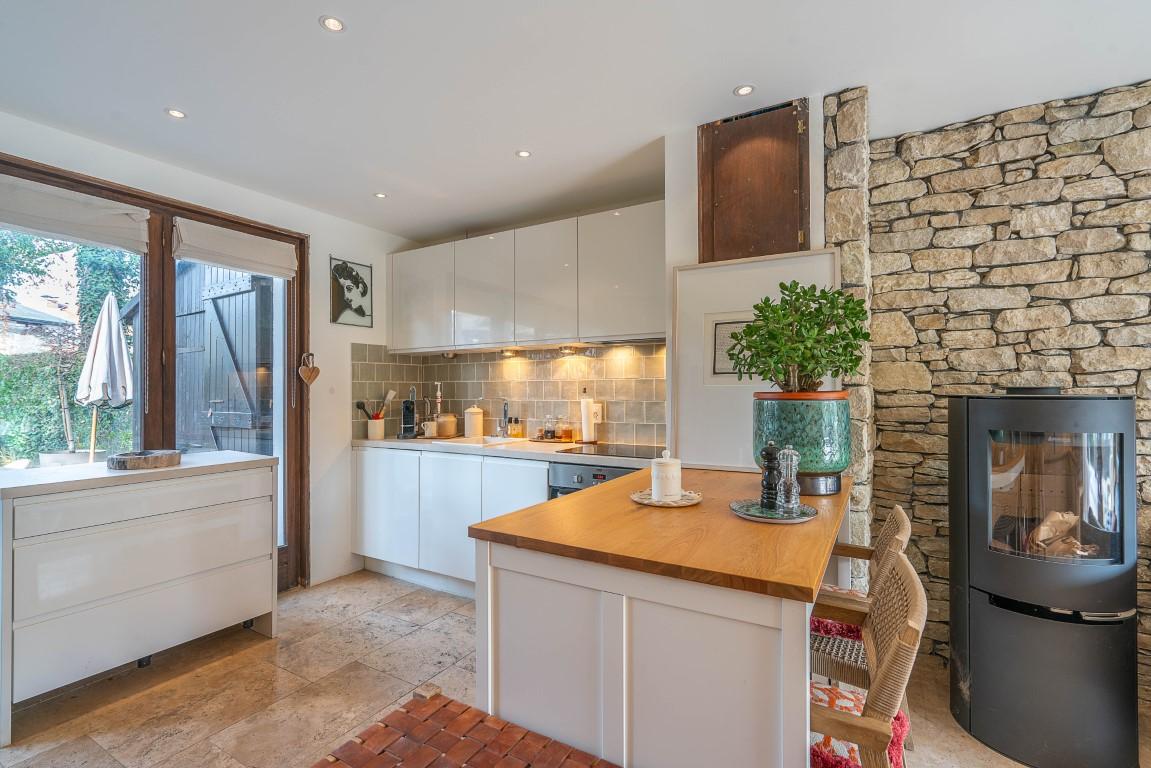 Un poêle à bois vient agréablement compléter le confort de cette pièce. À l’étage, deux chambres avec balcon ainsi qu’une salle d’eau composent le coin nuit.